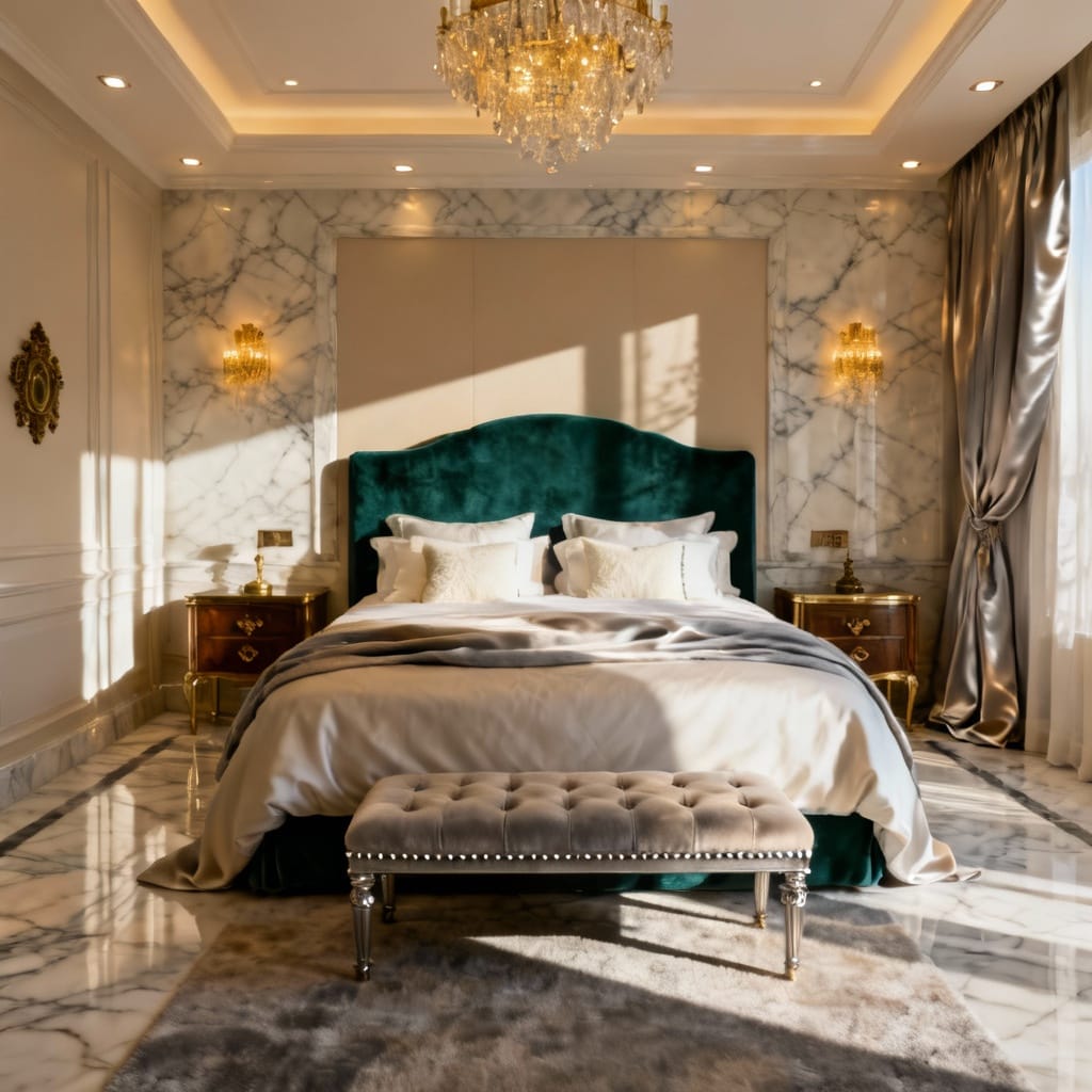 Prompt: Luxurious master bedroom with marble accents, velvet headboard, ambient lighting, king bed, neutral palette, high-end materials, editorial photo