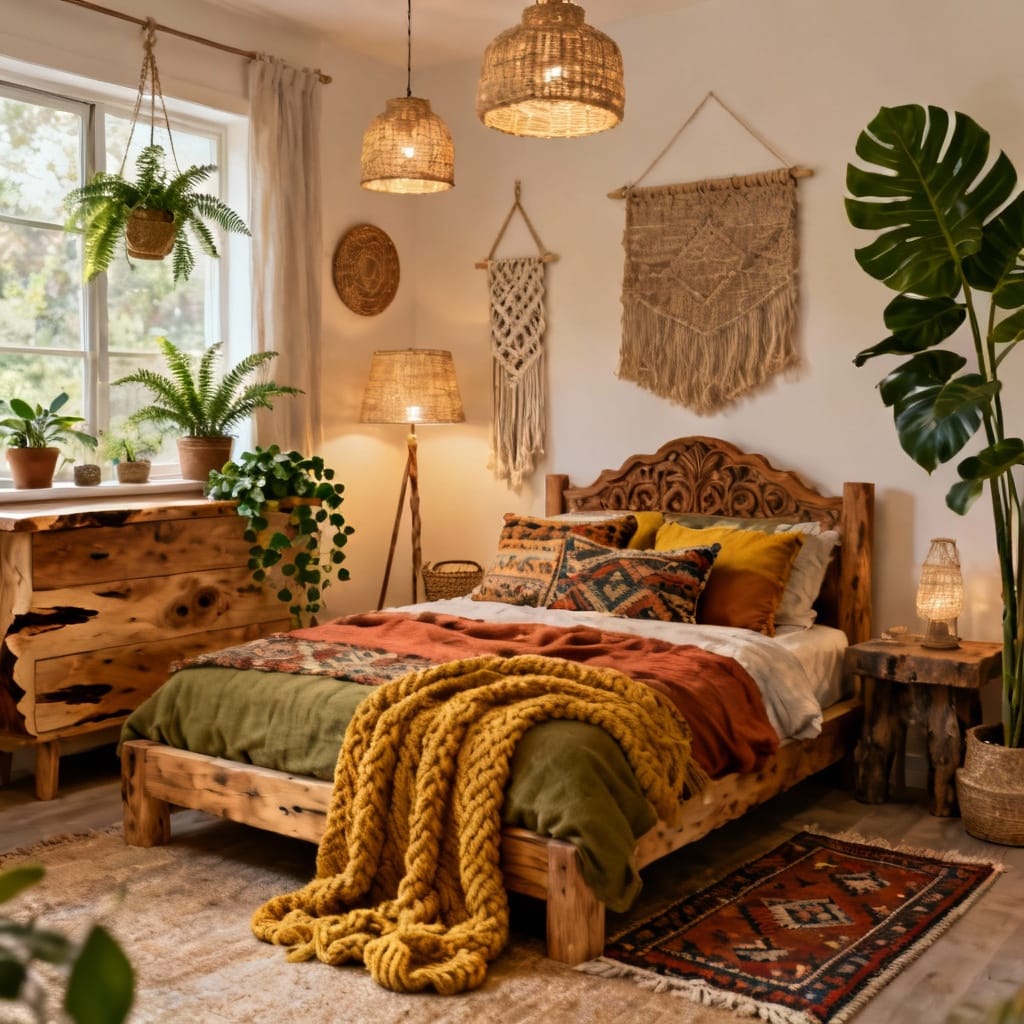 Prompt: Cozy bohemian bedroom with layered textiles, woven decor, indoor plants, natural wood furniture, earth tones, warm lighting