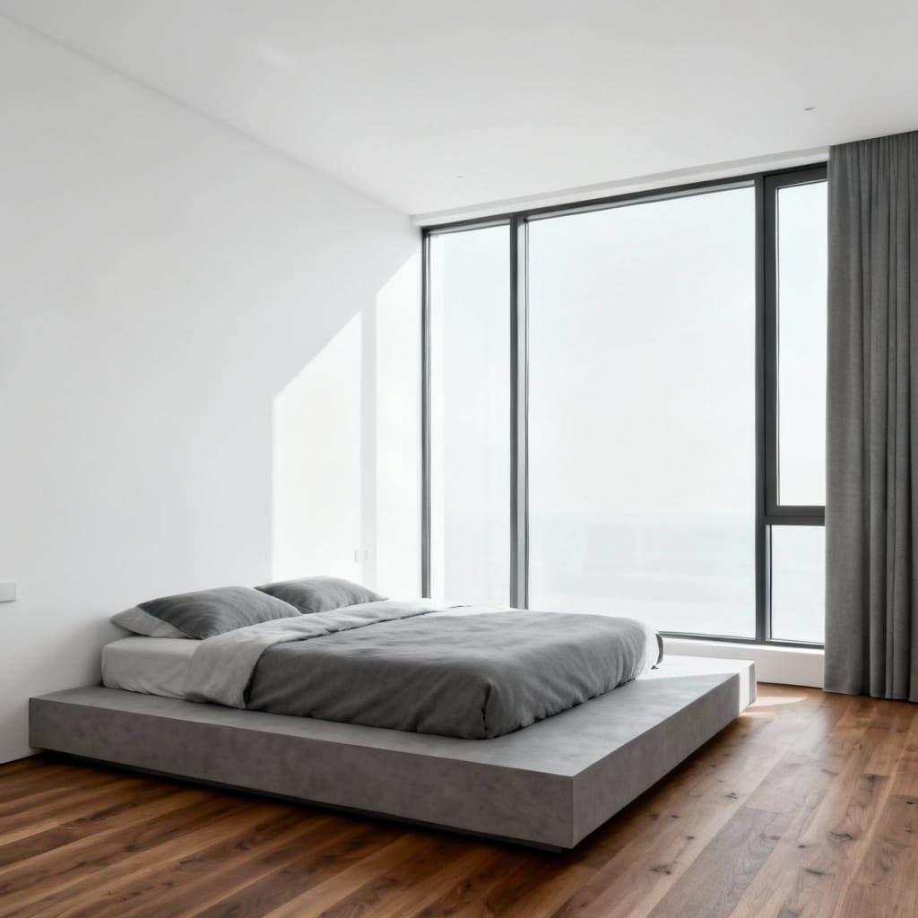 Prompt: Minimalist bedroom with floor-to-ceiling windows, low platform bed, white walls, gray tones, wood flooring, soft natural light