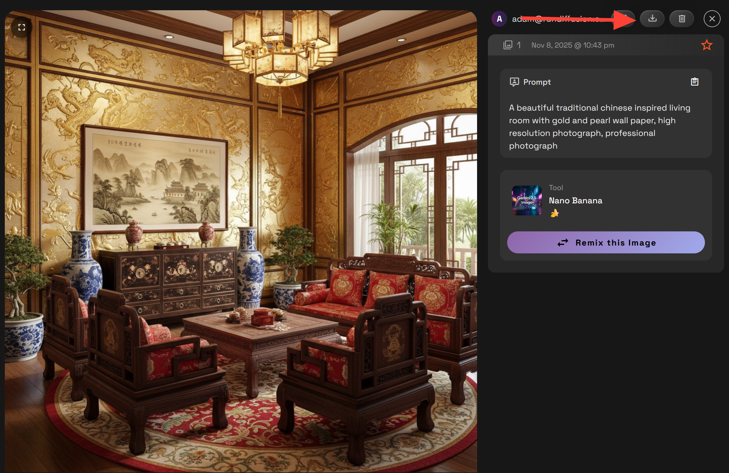 Example prompt: Redesign the room but keep the same layout, change the style from Chinese to Traditional American log cabin style.