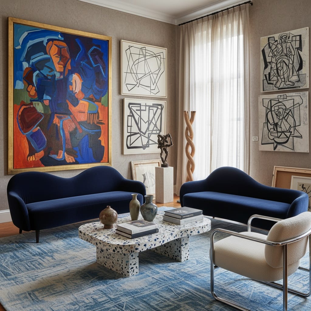 Prompt:Eclectic living room designed for an art collector, featuring sculptural furniture, oversized modern paintings, a terrazzo coffee table, and deep navy velvet sofas