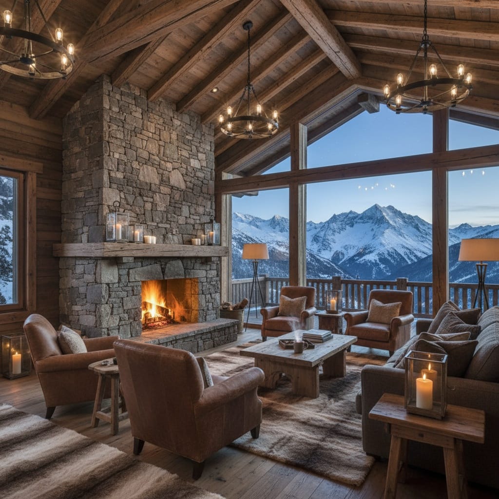 Prompt:Rustic alpine living room with exposed timber beams, stone fireplace, fur rugs, panoramic glass wall overlooking snowy peaks, and ambient warm lighting