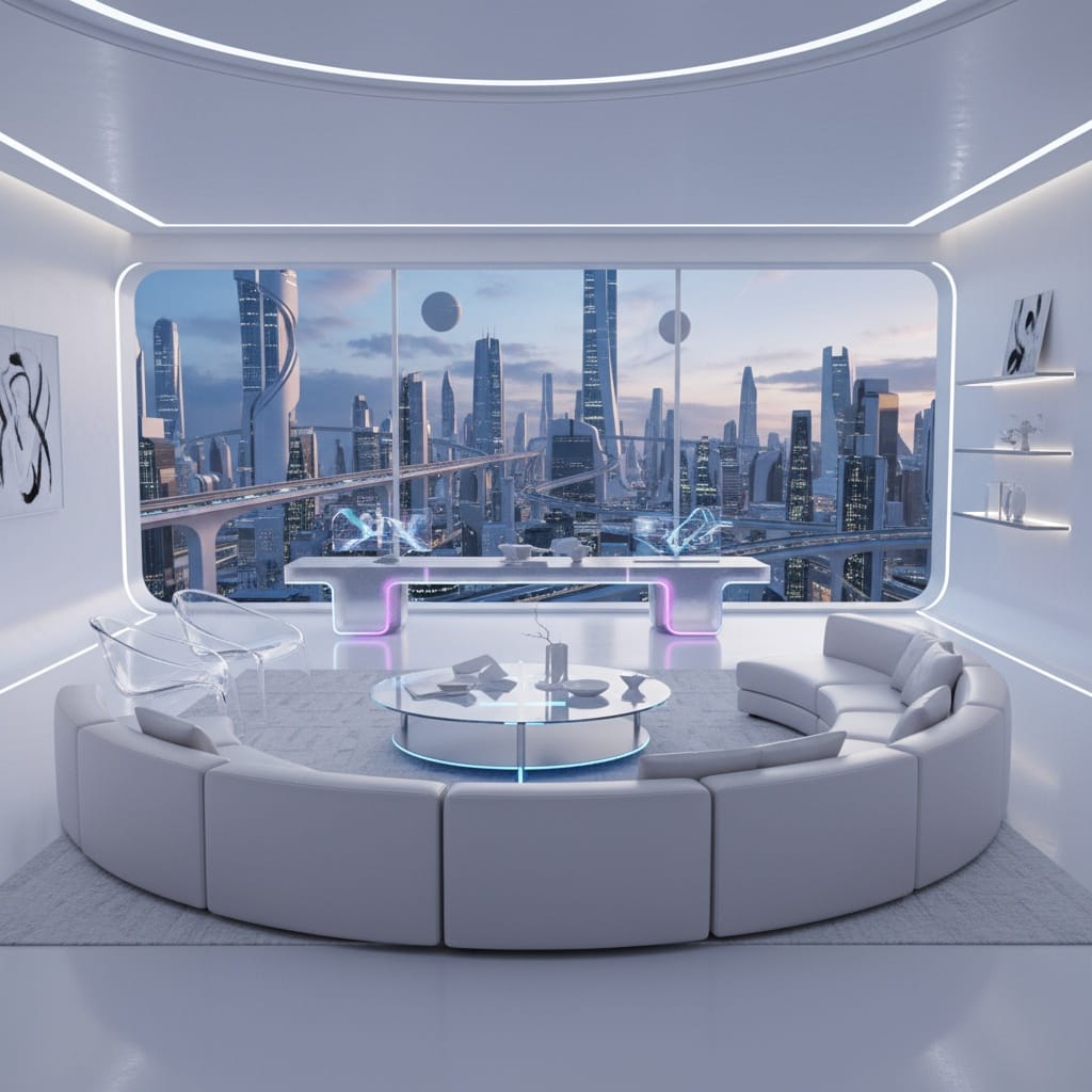Prompt:Futuristic living room with curved modular seating, acrylic furnishings, glowing LED accents, white epoxy floors, and a panoramic city view