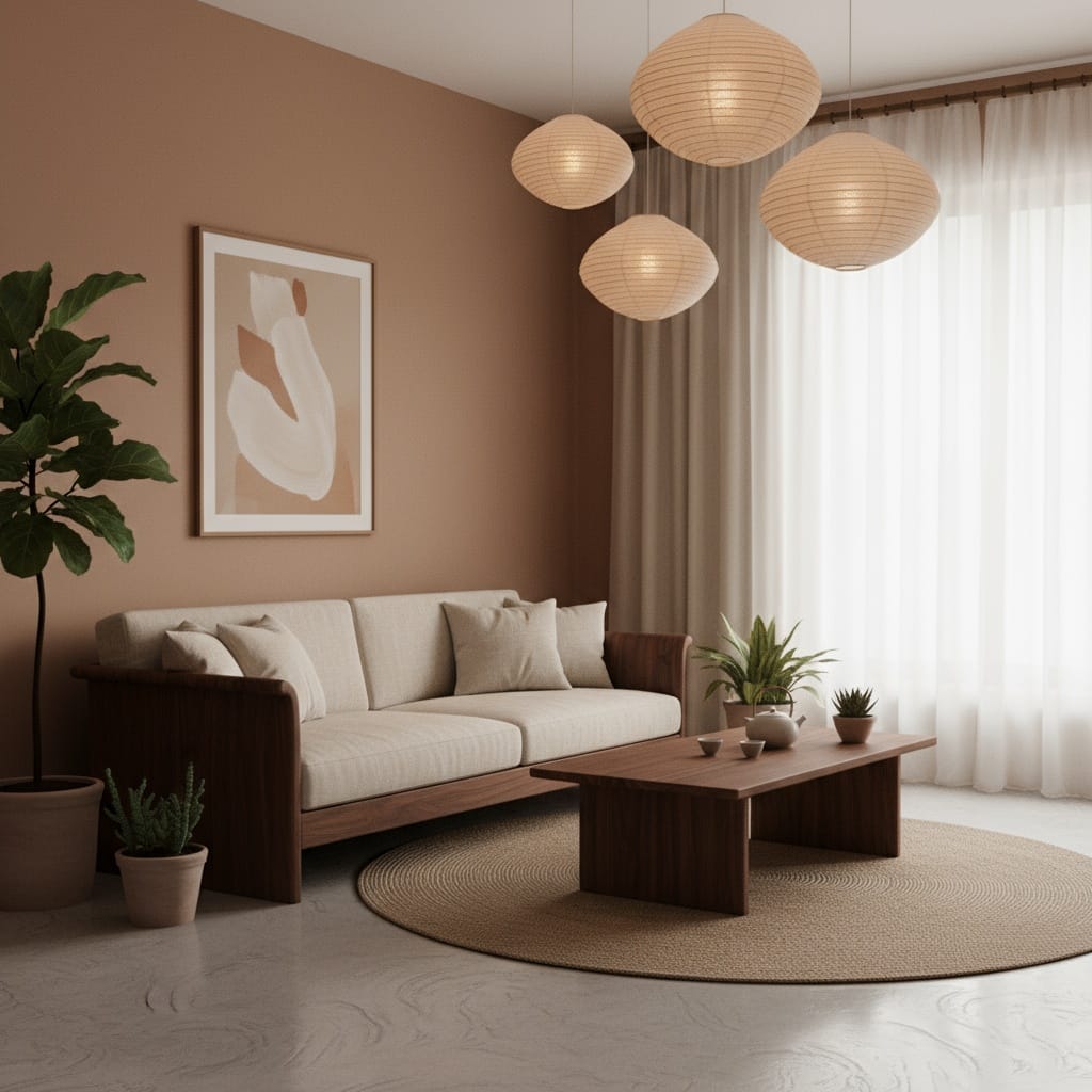 Prompt:A calming Japandi-style living room with clay-toned walls, low-profile walnut furniture, linen curtains, paper lantern lighting, and a polished concrete floor