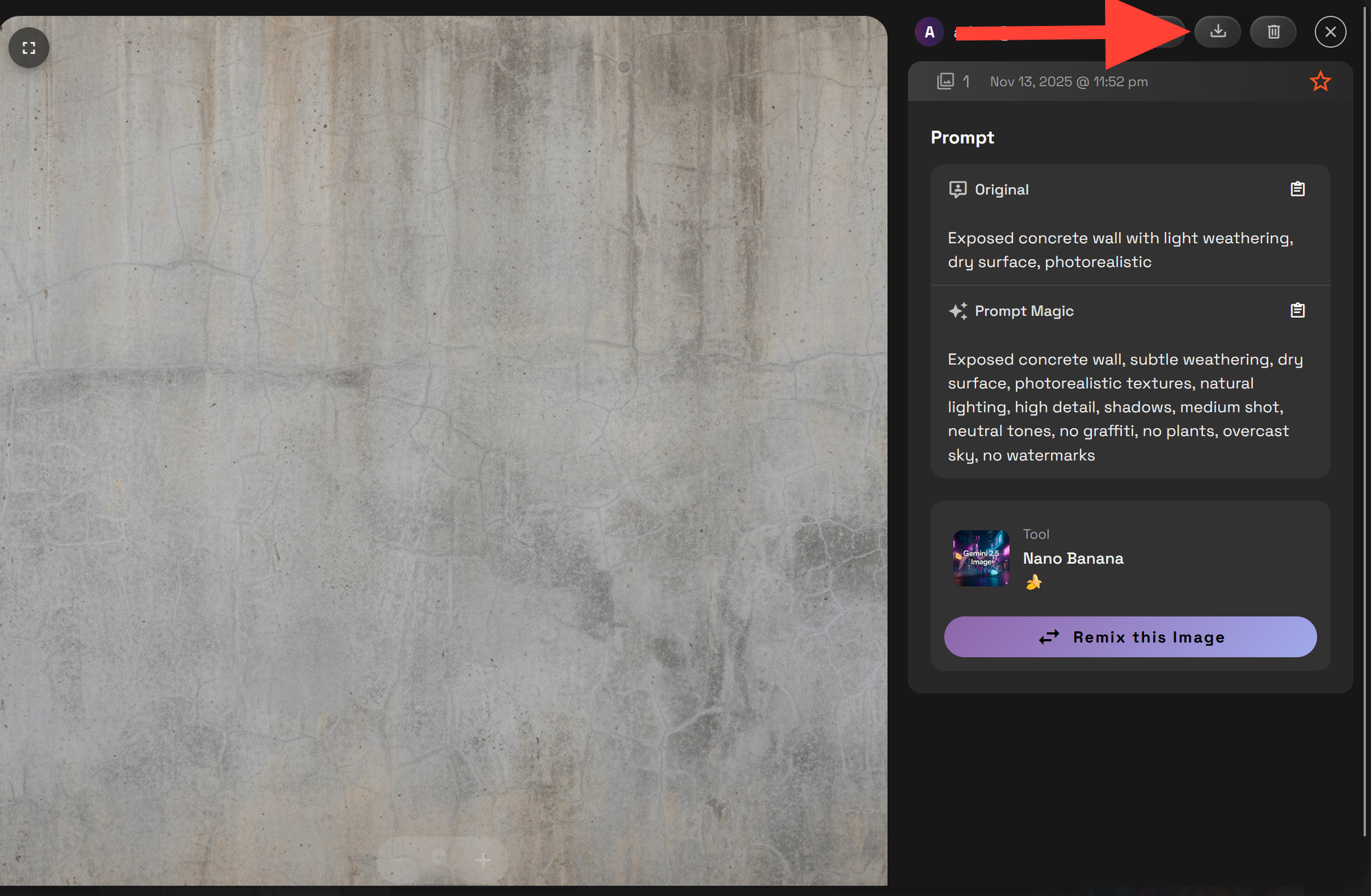 Example Prompt: Exposed concrete wall with light weathering, dry surface, photorealistic