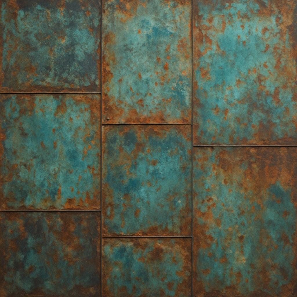 Prompt: Close up of a Recycled metal panel with patina and oxidized finish