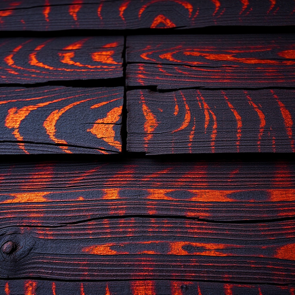 Prompt: Close-up of burnt wood siding in Shou Sugi Ban style, showcasing intricate textures, dramatic lighting, high contrast