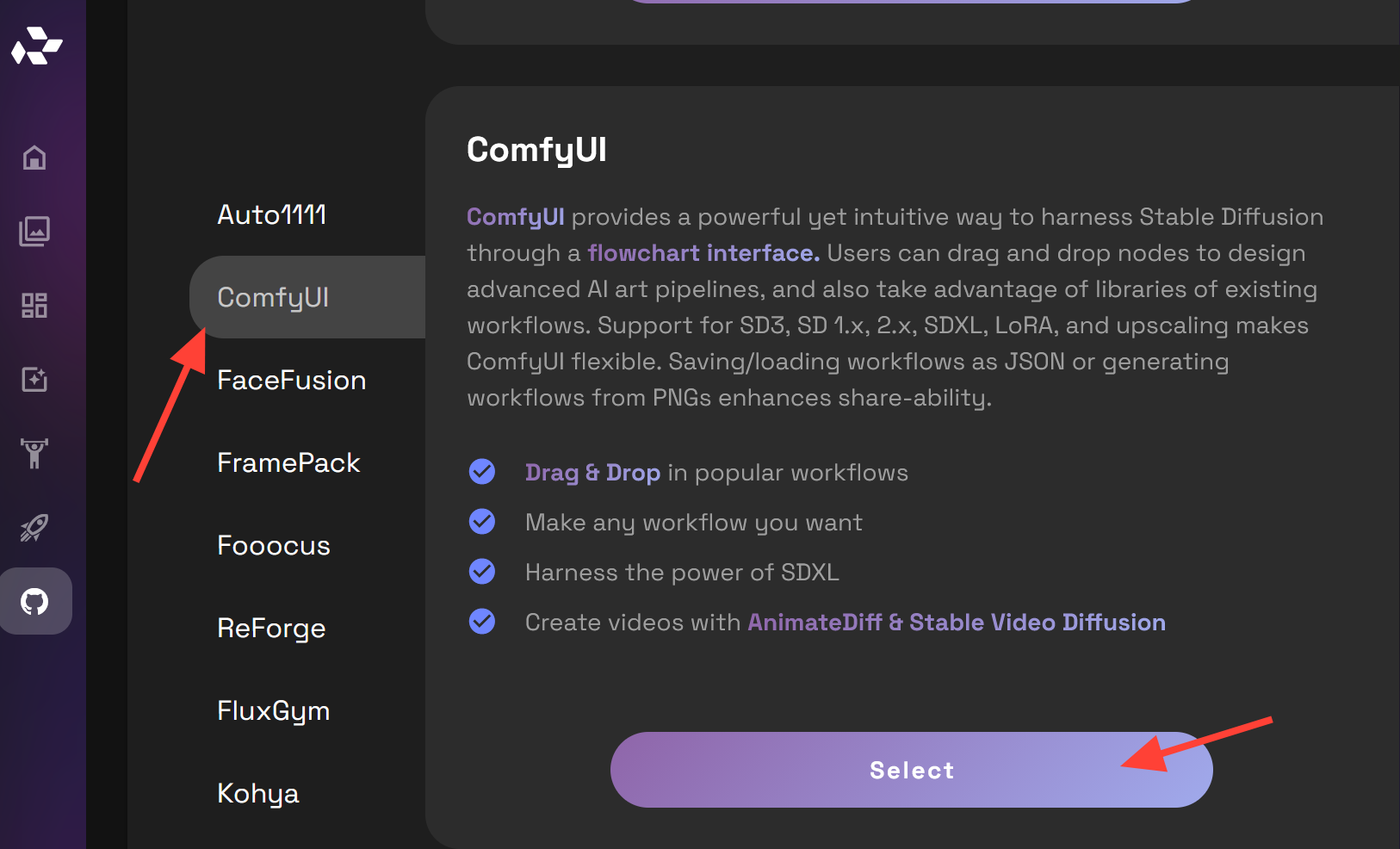 Choose ComfyUI and click Select.