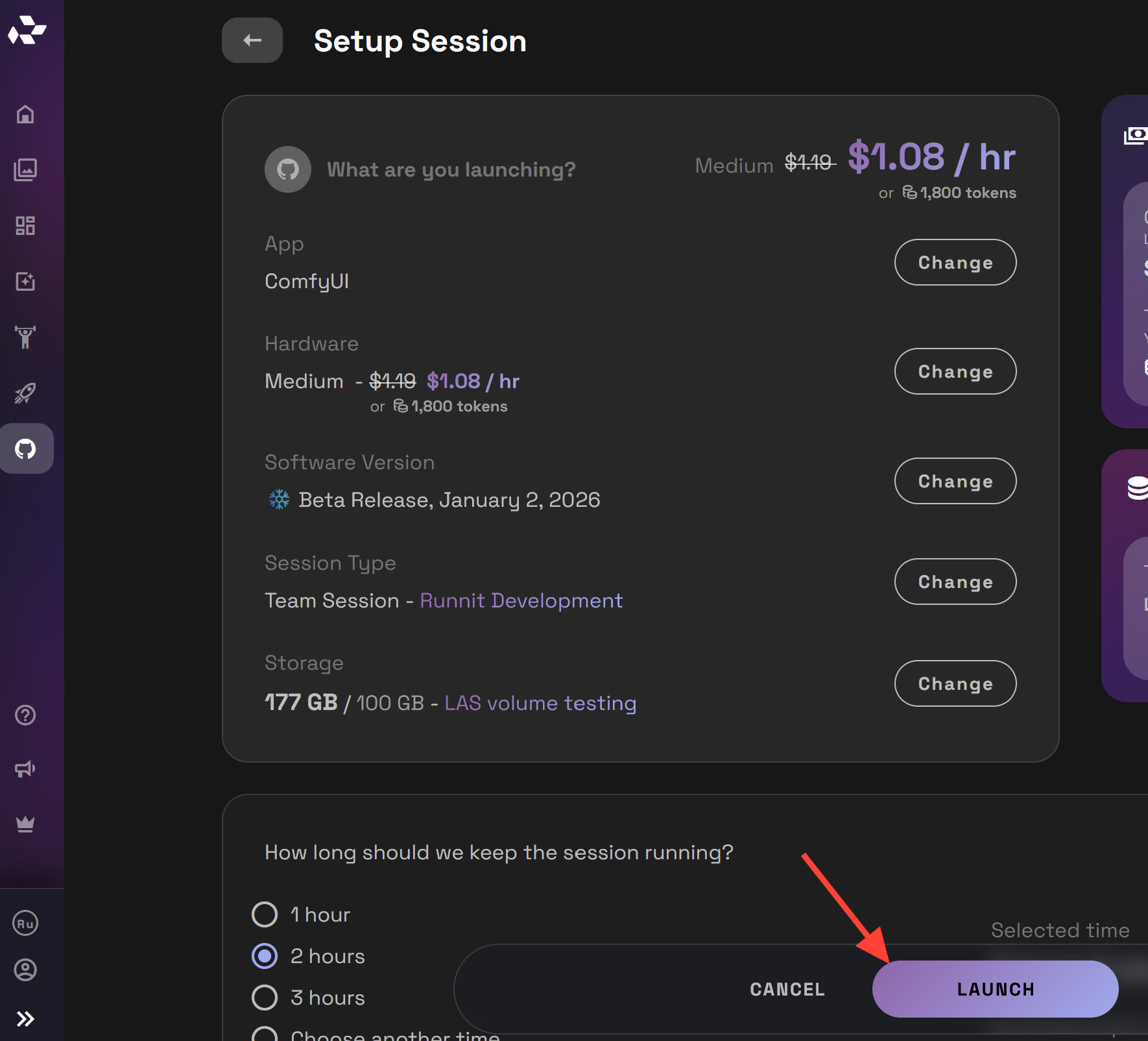 Launch a server using your preferred hardware configuration. For AnimateDiff we recommend a Medium or Large Server. Click the Launch button.