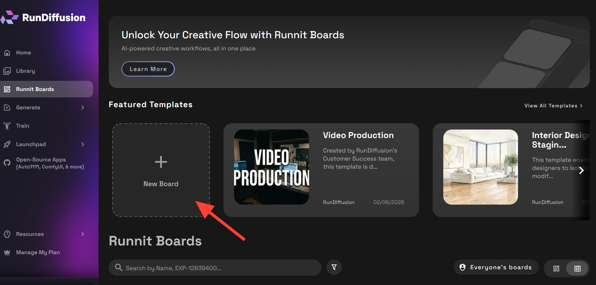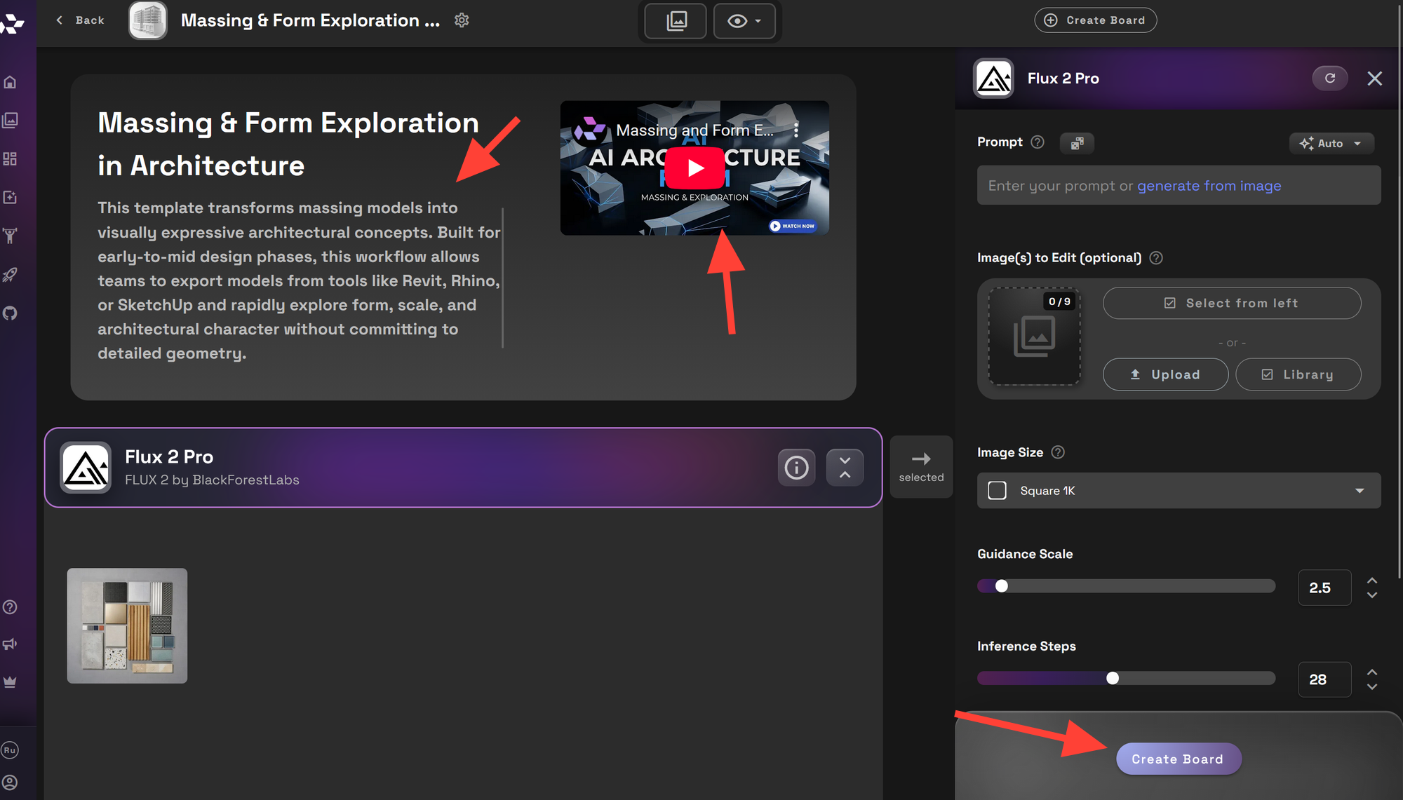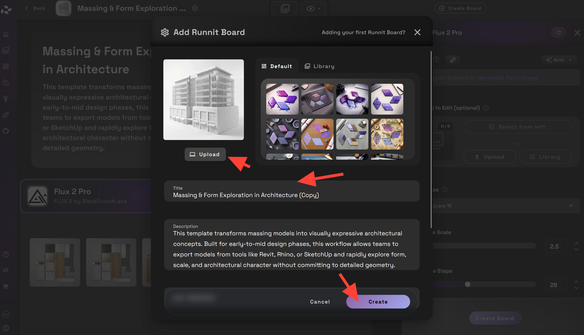 A Featured Template is a prebuilt workflow designed for specific production outcomes such as sketch-to-render, massing exploration, floor plan visualization, or high-resolution presentation imagery. When loaded into Runnit and converted into a Board, it becomes an editable production pipeline for your team.