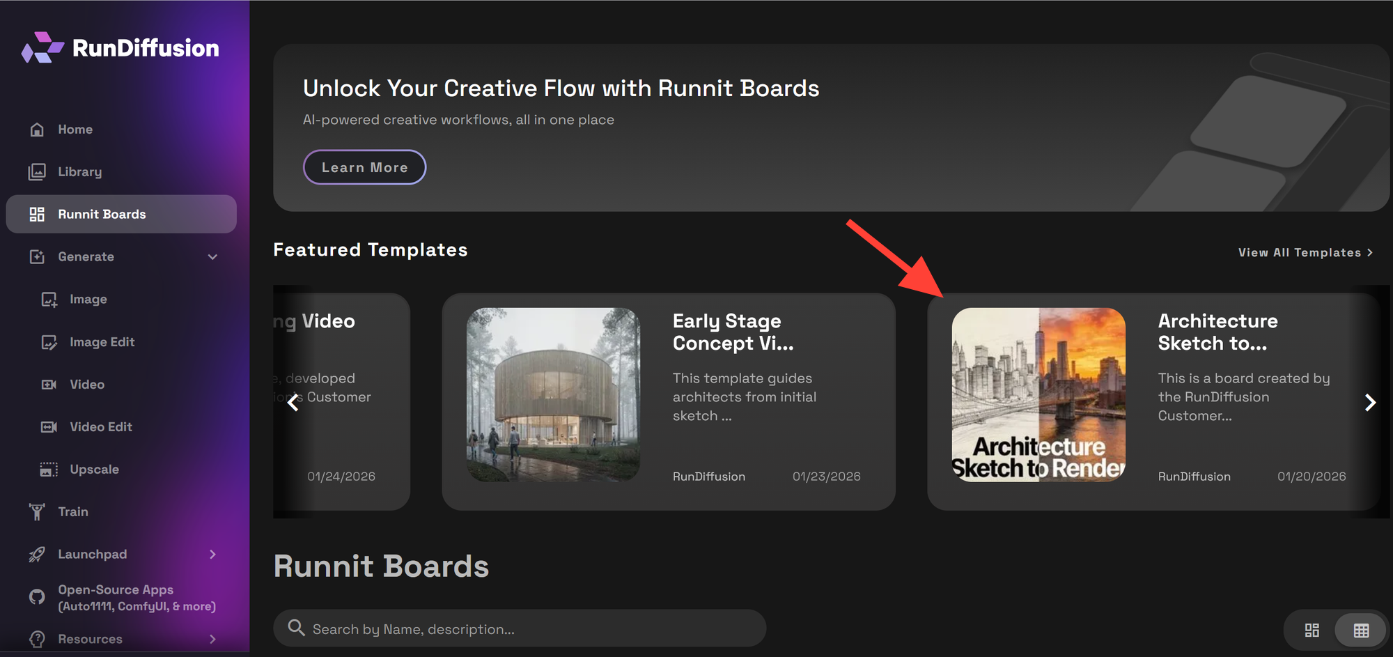 The Architecture Sketch to Render V2 Template is available through RunDiffusion’s Featured Templates library.