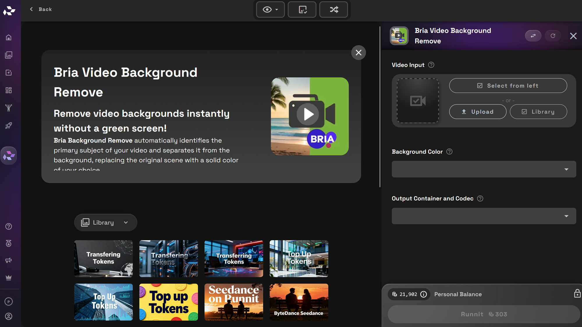 Bria Background Remove on RunDiffusion is a tool on our Runnit Platform that uses AI to identify the primary subject in a video, remove the background, and replace it with a solid color. It works directly in the browser, which means no software installation or local GPU required.