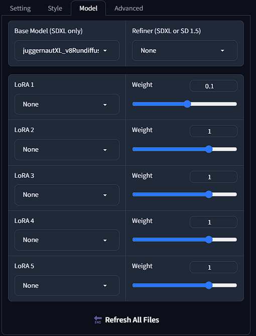 This is where you will select your model and LoRA. You also have the option to select multiple LoRA's and their weight of influence.