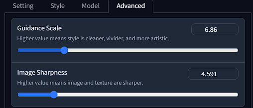 In the advanced tab you will have the ability to adjust the Guidance Scale and the Image Sharpness. This will all depend on your prompt and models, trial and error is key with this menu.