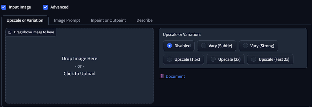 Input image is where we will be able to access our inpainting, describe and upscaling and the Advanced tab is where we will find all of the options including resolution, styles, models, LoRA's, and guidance.