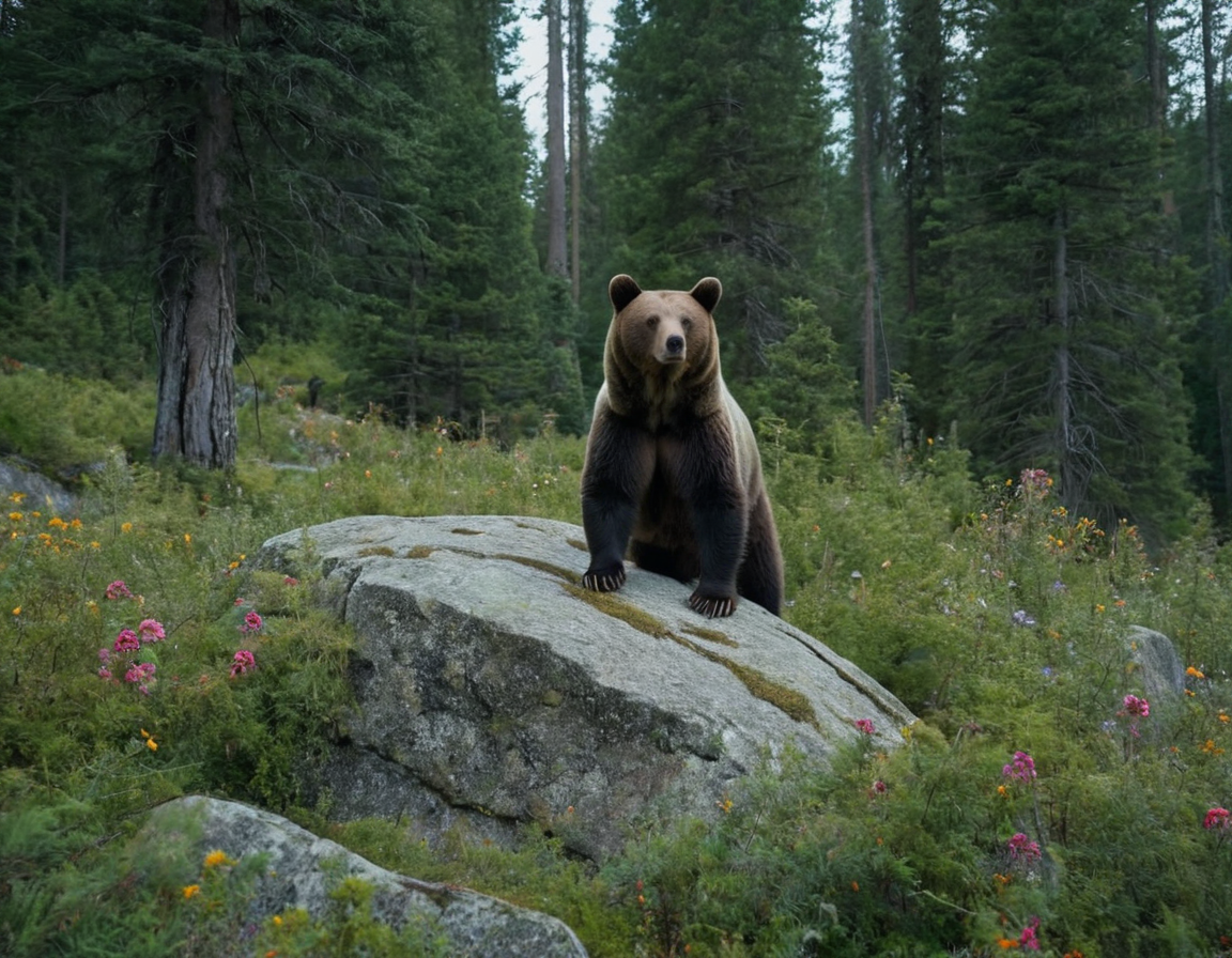 highly detailed forest, large trees, floral ground, bear standing on rock