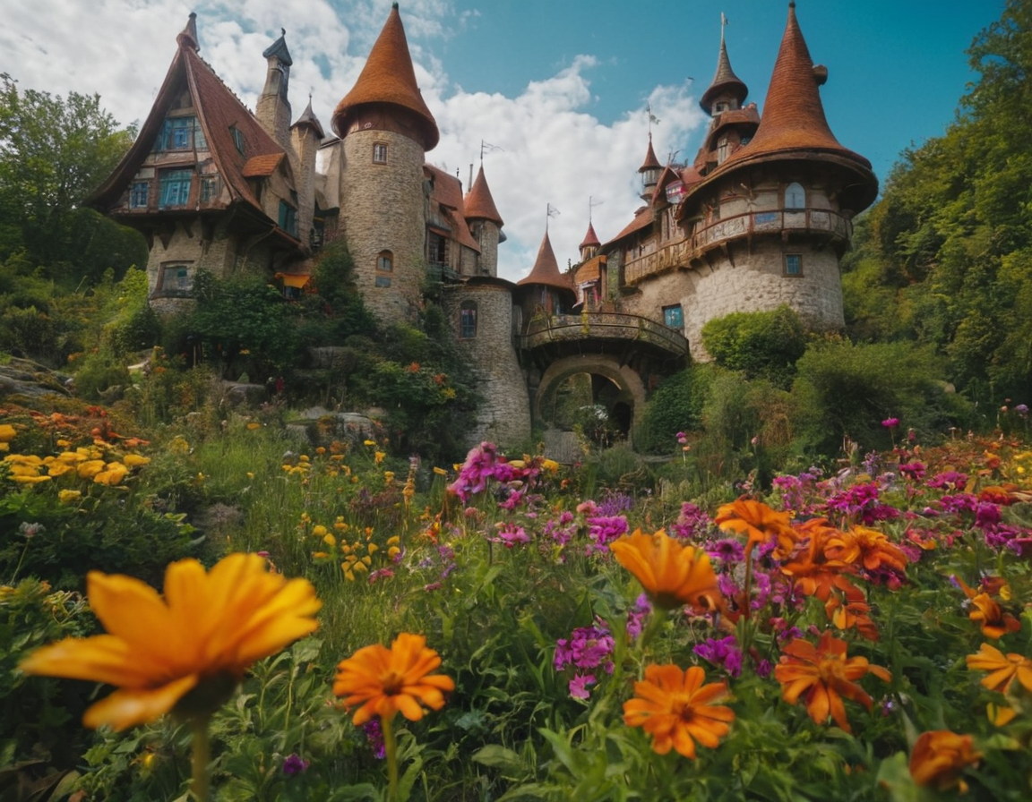 highly detailed fairytale land, vivid colors, weird buildings, trippy flowers