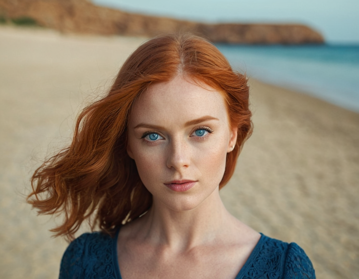 highly detailed portrait, lady standing on the beach, red hair, blue eyes, perfect skin