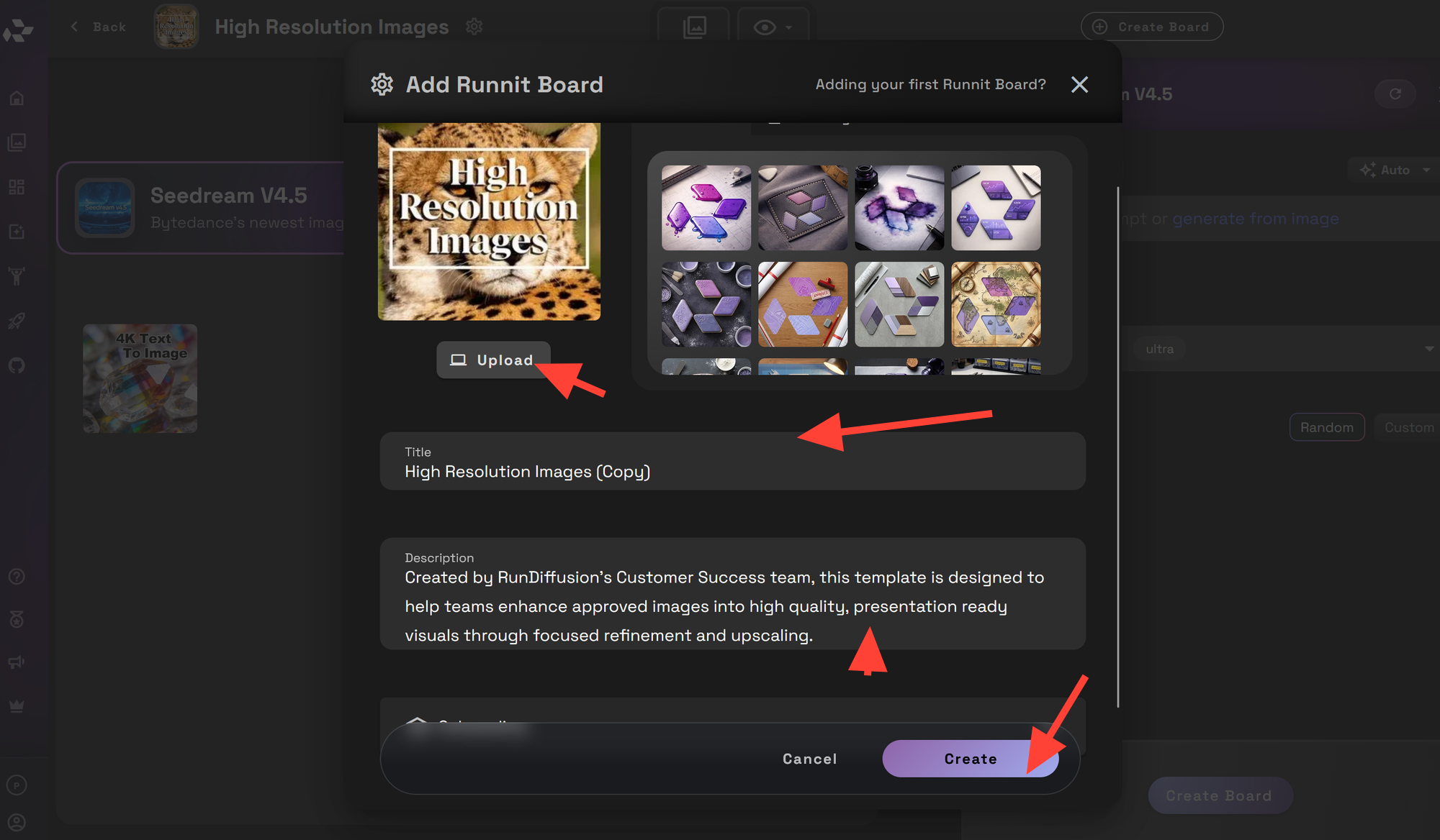 The High Resolution Image for Print template is a curated Runnit Board that combines high-resolution image generation, editing, and professional upscaling tools. It is designed to help you create print-ready visuals without managing local GPUs or complex software setups.