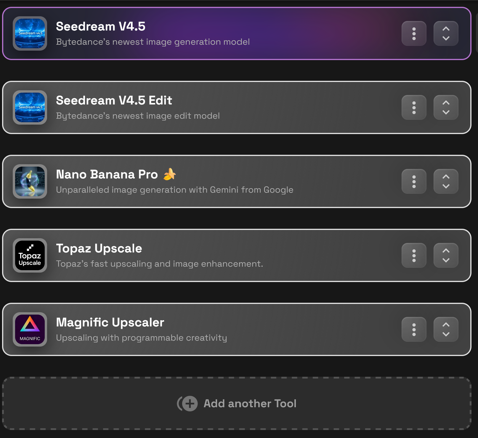 Seedream V4.5 is the primary text-to-image model in this template. It supports native 2K–4K outputs, making it well suited for print-oriented workflows where structure and clarity matter from the start.
