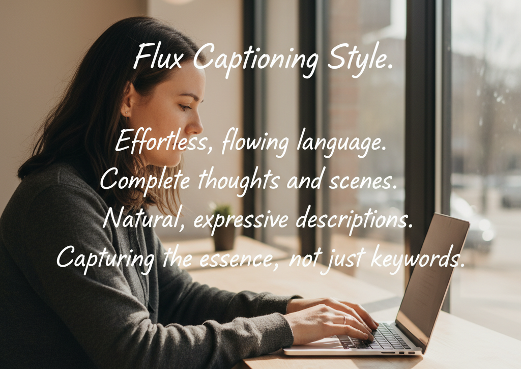 Flux models excel when trained with natural-language prompts that read like real world generation requests not tag lists, and not overly compressed. Captions should describe what is in the image as you'd prompt it, using clear, complete phrases.