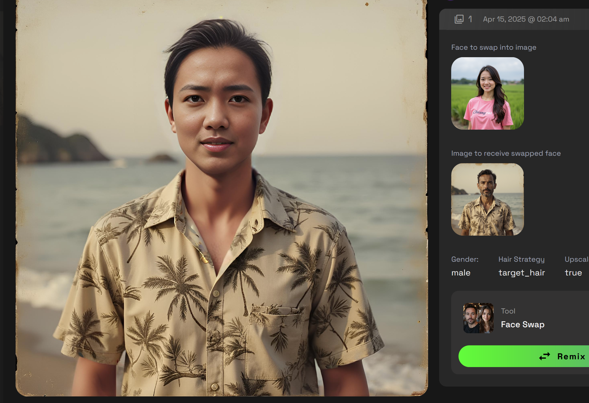 - Use source person’s hair: transfers the face and the source hair (may not align perfectly)