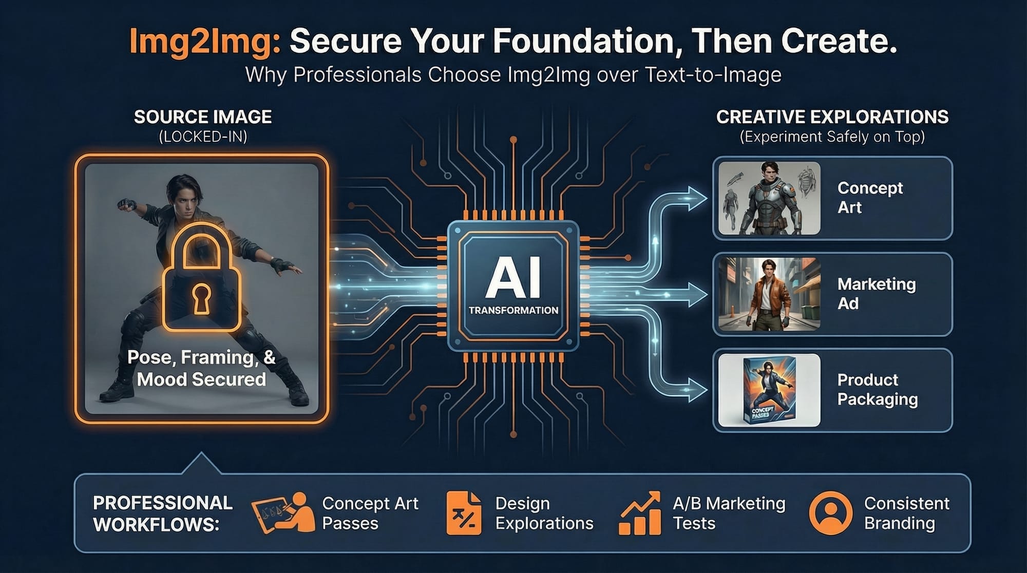 Why reach for img2img instead of plain text-to-image? Because you already solved the hardest parts: framing, pose, layout, and overall mood. Img2img lets you lock those in while experimenting safely on top. That’s why creative teams are increasingly using img2img workflows for concept art passes, design explorations, A/B tests of marketing images, and consistent character or product renderings across many scenes.