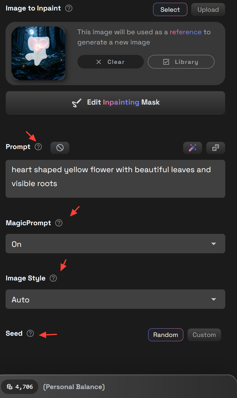 - Enter a descriptive prompt to guide the inpainting process. Magic prompt is on by default which can assist you in helping to create meaningful prompts. If you don't need it you can select the drop down arrow and turn it off.