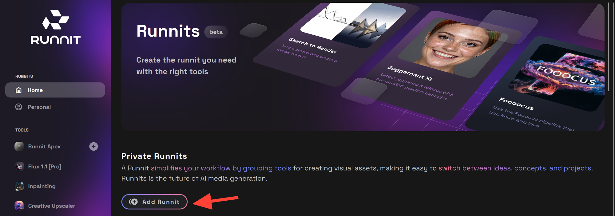- Select the option to add a new Runnit, setting up a dedicated workspace for your inpainting tools. This tool can also be added to other runnit you create.