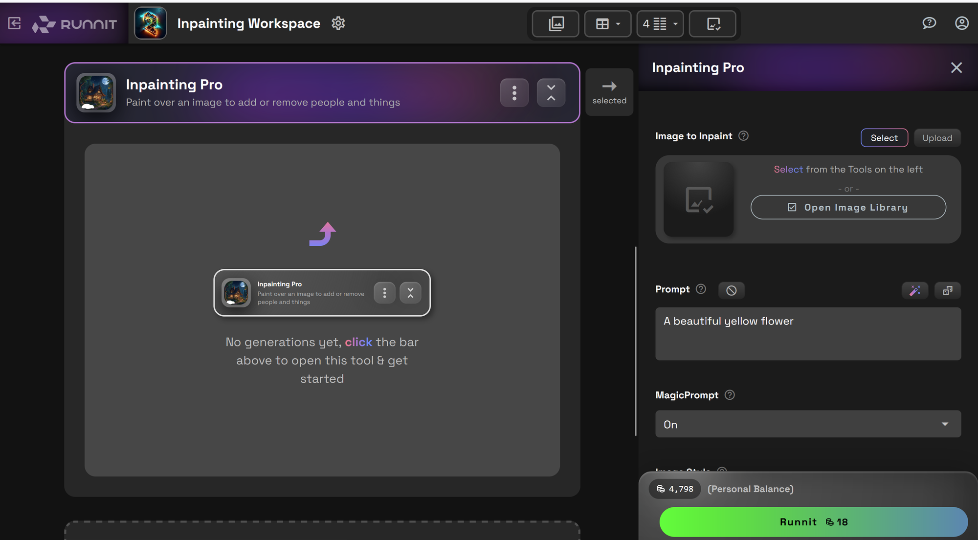 Adding an Inpainting Pro tool to your Runnit provides a powerful tool for enhancing and refining images by blending edits naturally into the original visuals. With this setup, you can easily access inpainting features whenever you need them, enabling you to create polished, professional-quality images directly within your Runnits workspace.