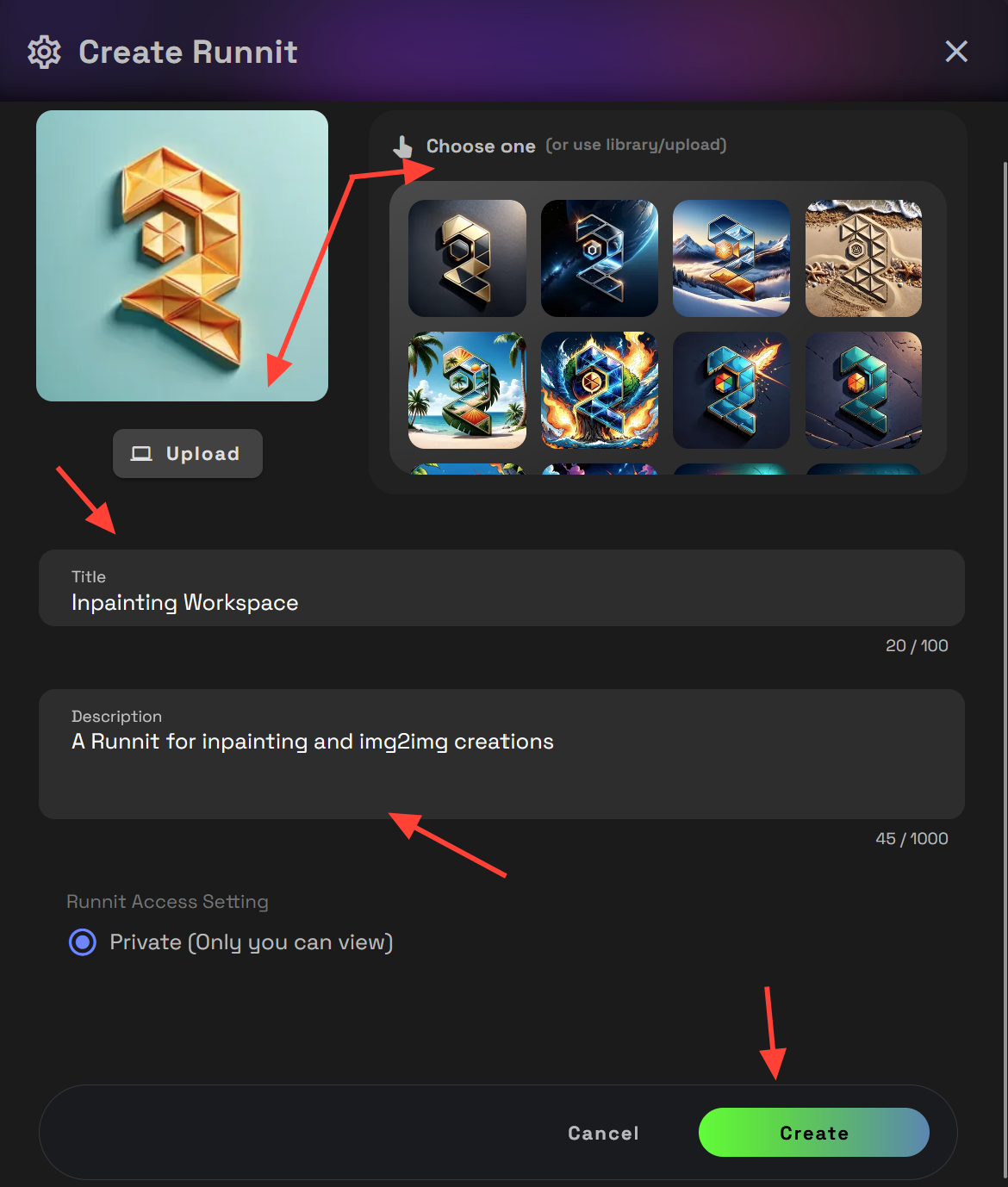 - Choose a name that clearly indicates this Runnit is for inpainting, like “Inpainting Workspace,” and add a brief description if needed to keep your projects organized. Select Create to save it.