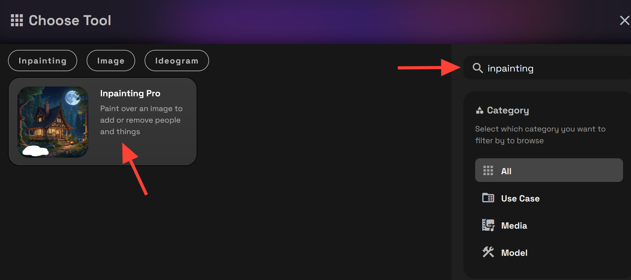 - From the available tools, choose Inpainting Pro to add it to your workspace. If you have trouble finding it you can search for tools on the right side. Once you have located the tool click on it. It will add it to your runnit.