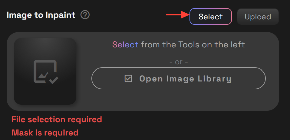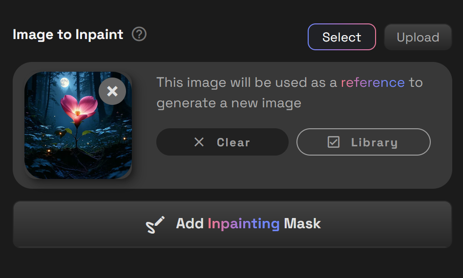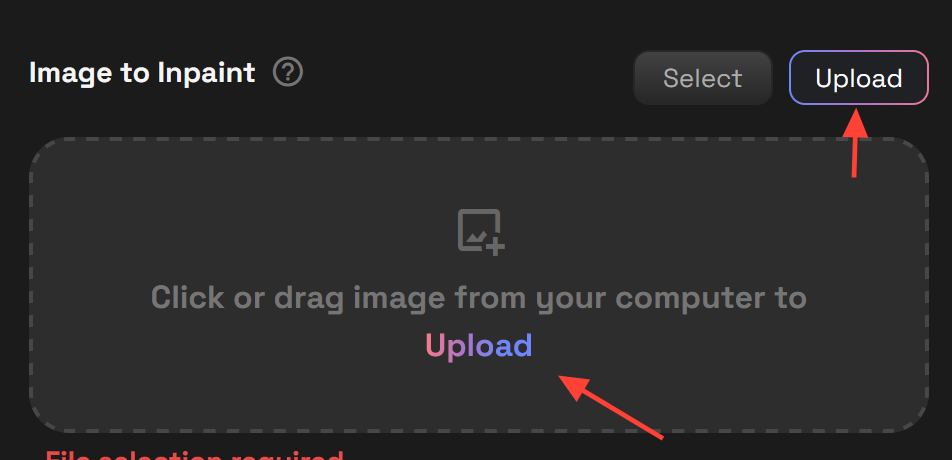 - Upload or Select an image you’d like to edit. This image will serve as the base for your inpainting adjustments.