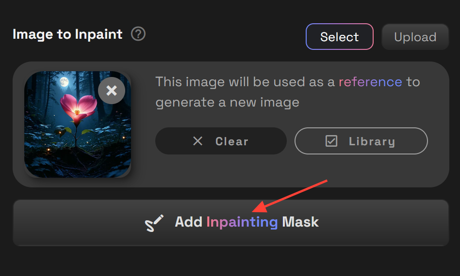 - Click the Add Inpainting Mask button this will open the Inpainting Editor. The mask you create will directs the AI to only make changes to the masked area of the image.
