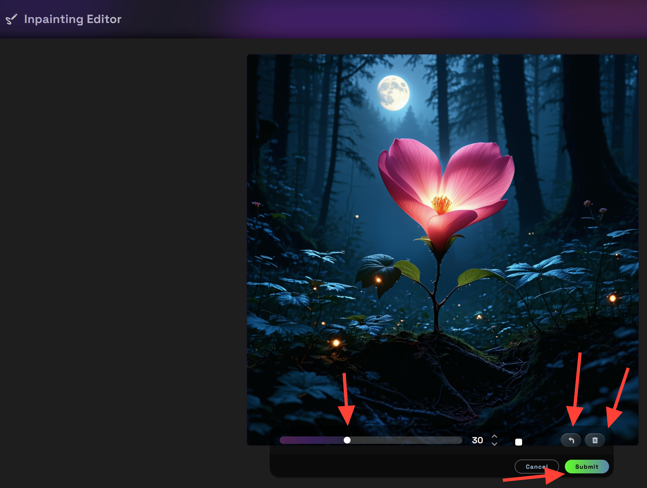 - The inpainting editor has several key features. Bottom left has a slider that can adjust the size of your brush and an undo button you can use if you accidentally apply the mask to the wrong area. Bring your mouse over the part of the image you wish to apply the mask and use your left mouse button to begin applying the mask. The delete button will remove the entire mask you created and the submit will save the mask.