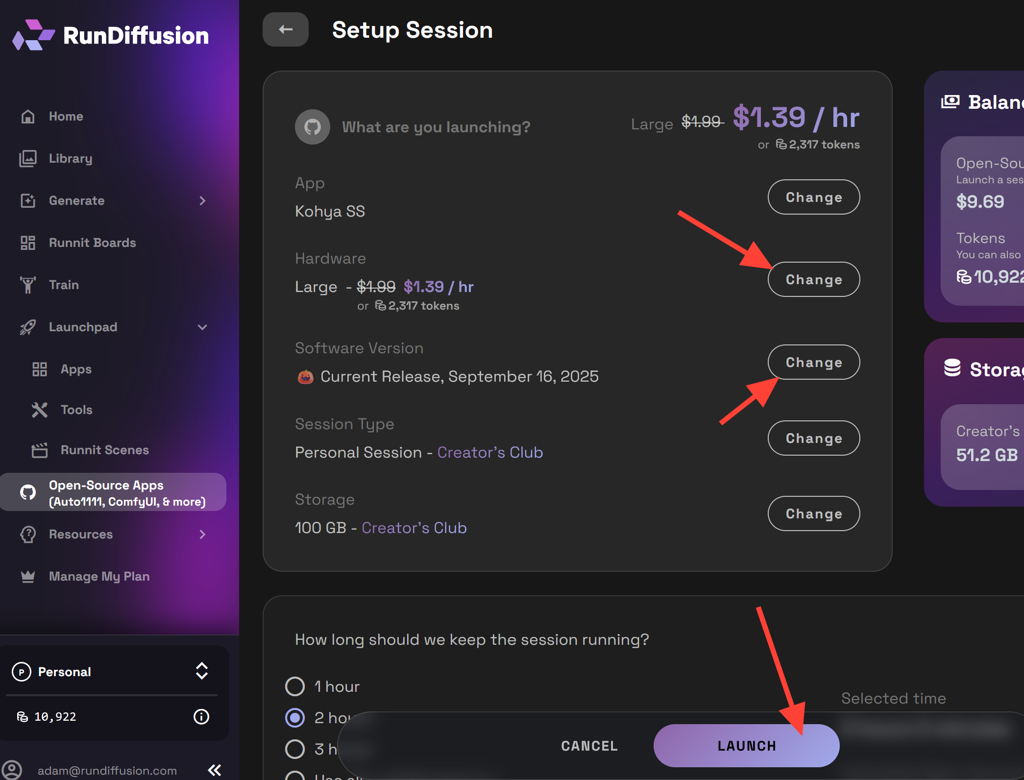 For Hardware select Large or Max. Use Current Release, September 16, 2025 or later. Then click Launch. Training LoRa requires a lot of storage so we recommend having a Creators Club Subscription. Then click Launch.