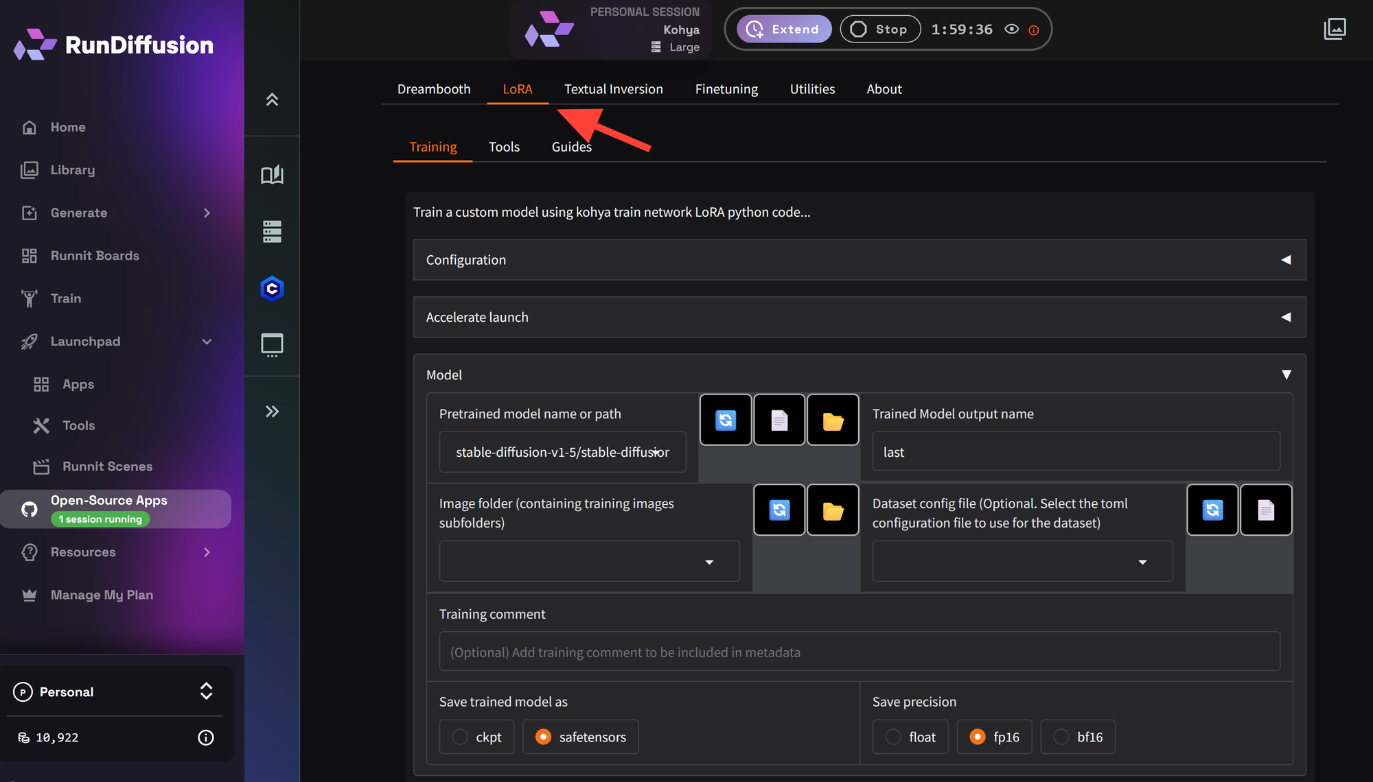 Click on Kohya on the Opensource application list then click Select.
