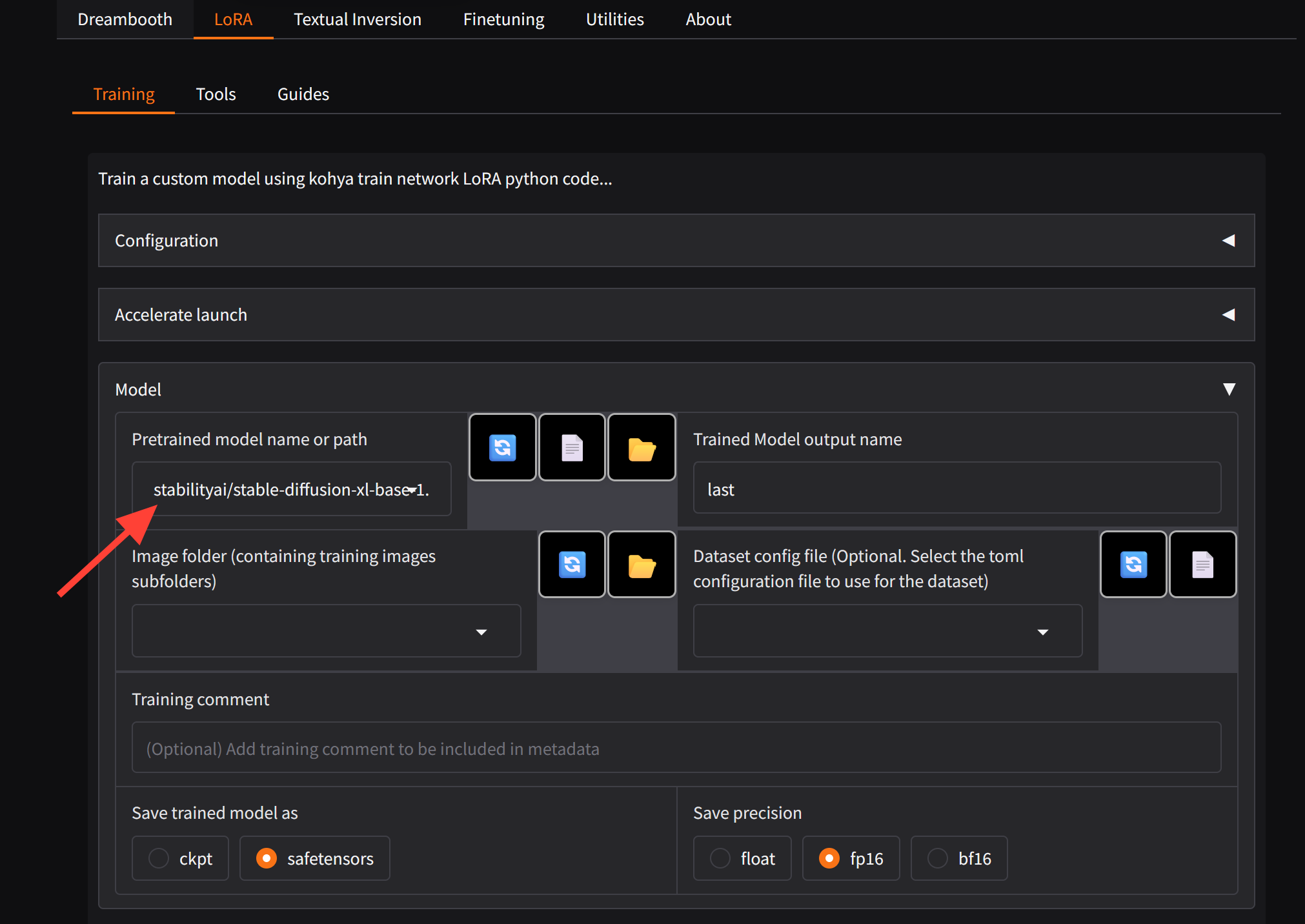 Next expand the Model section. Make sure you have stable-diffusion-xl-base-1.0 selected.