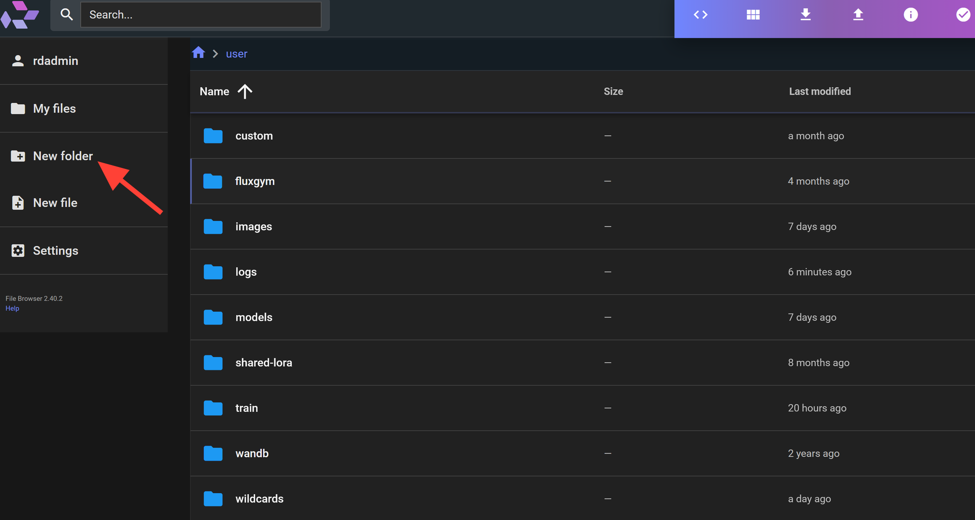 Open your Filebrowser by clicking on the arrow in the top right.