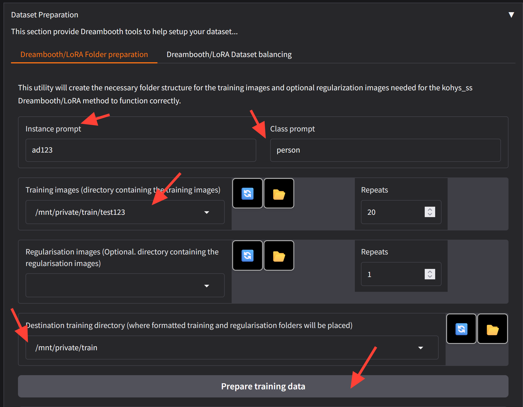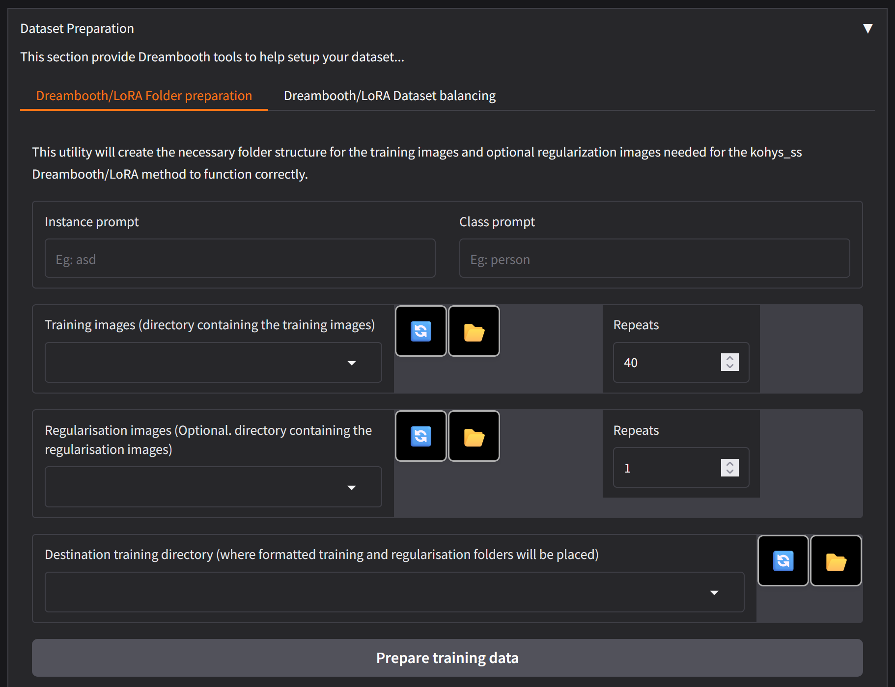 Once you click prepare training data check your folder in your file browser to be sure the folders were created. The Kohya is not responsive so it may look like nothing has happened. File browser doesn't automatically refresh so go to the parent directory and click on the train folder again.