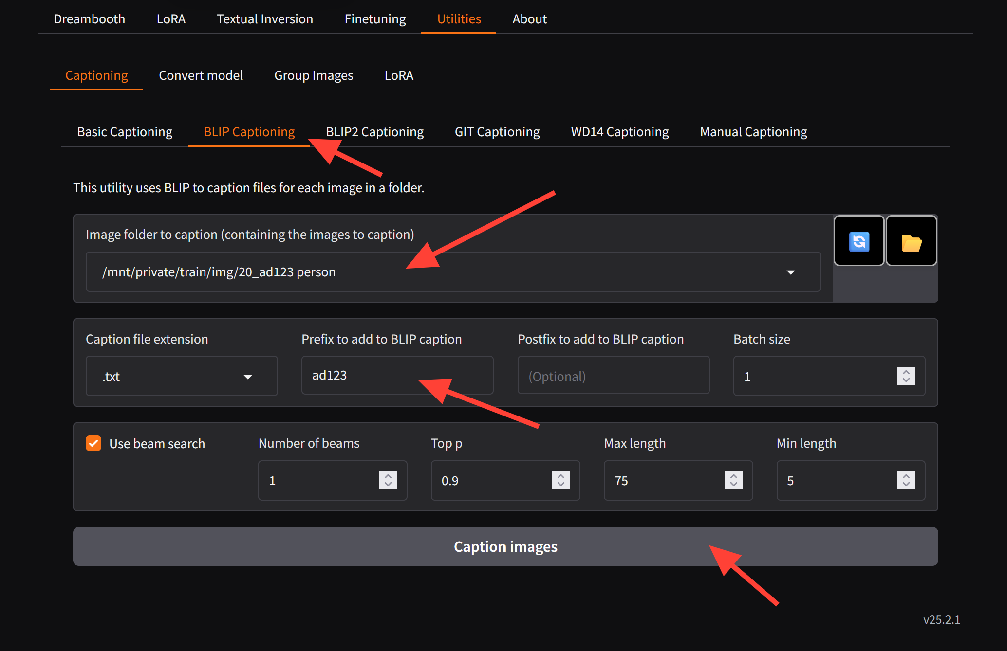 Select Blip Captioning. Then add the token in the Prefix to Add to BLIP caption. Then select caption images. You can also use Manual and other ways to caption.