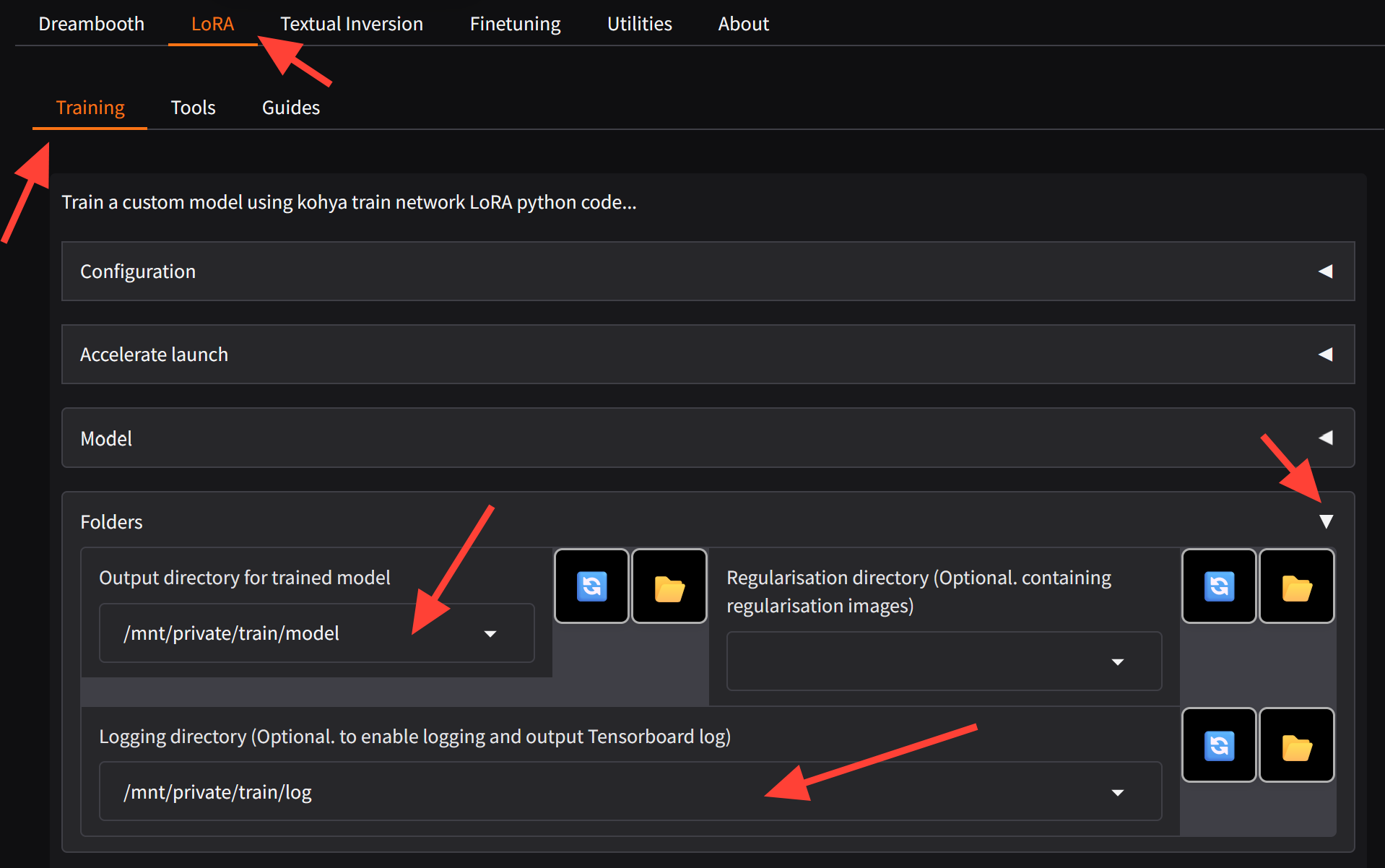 Return to the Lora Tab and click on the Folders drop down. Enter your Output and Logging Directory.