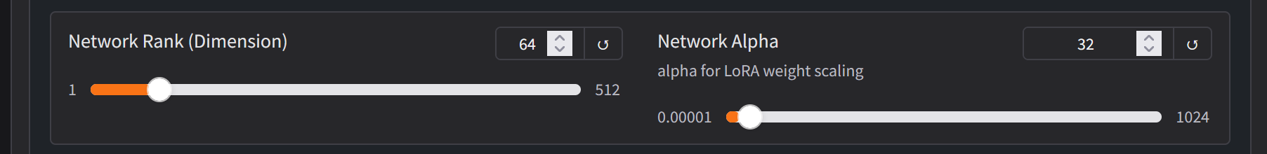 These values determine the capacity of your LoRa. Higher values increase model size and storage usage but do not guarantee better results. Many trainers observe diminishing returns beyond moderate settings such as Rank 64 and Alpha 32.