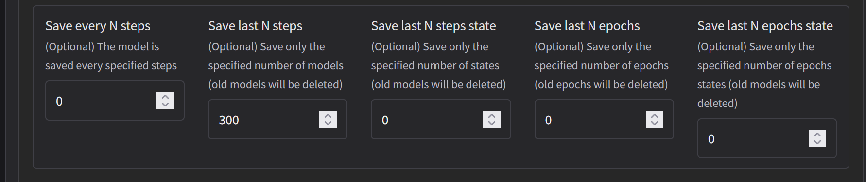 Go to Save every N Steps. And put a number of how often you want it to save the Lora. This is up to preference and your storage. In the example shown we have Save last N Steps set to 300.