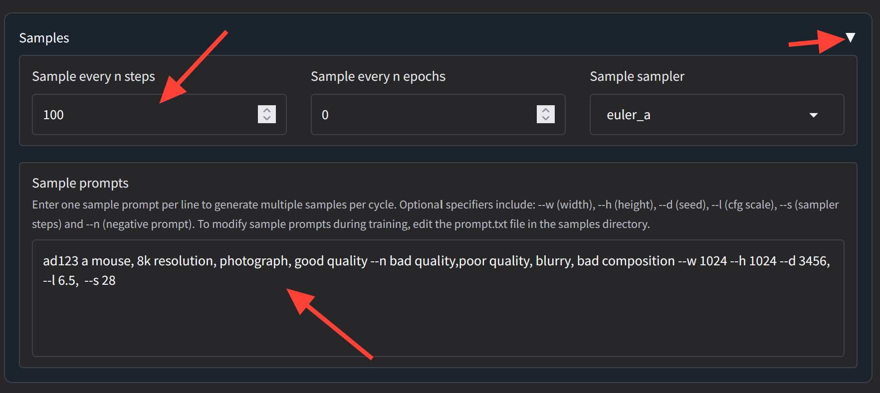 Sample prompts allow Kohya to generate preview images during training. These samples help you visually assess progress, convergence, and overfitting without stopping the training run.