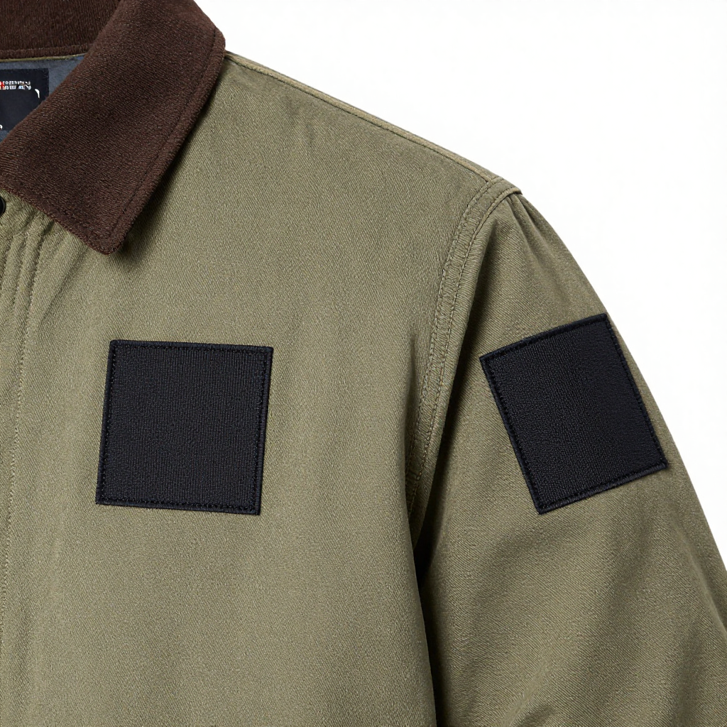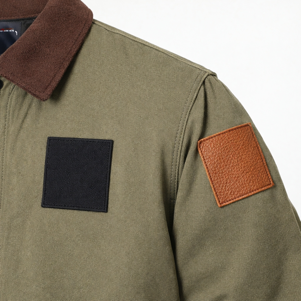 Prompt: Follow and remove the annotations marked on the image; Apply the leather fabric texture from the reference image to the circled patch on the jacket.