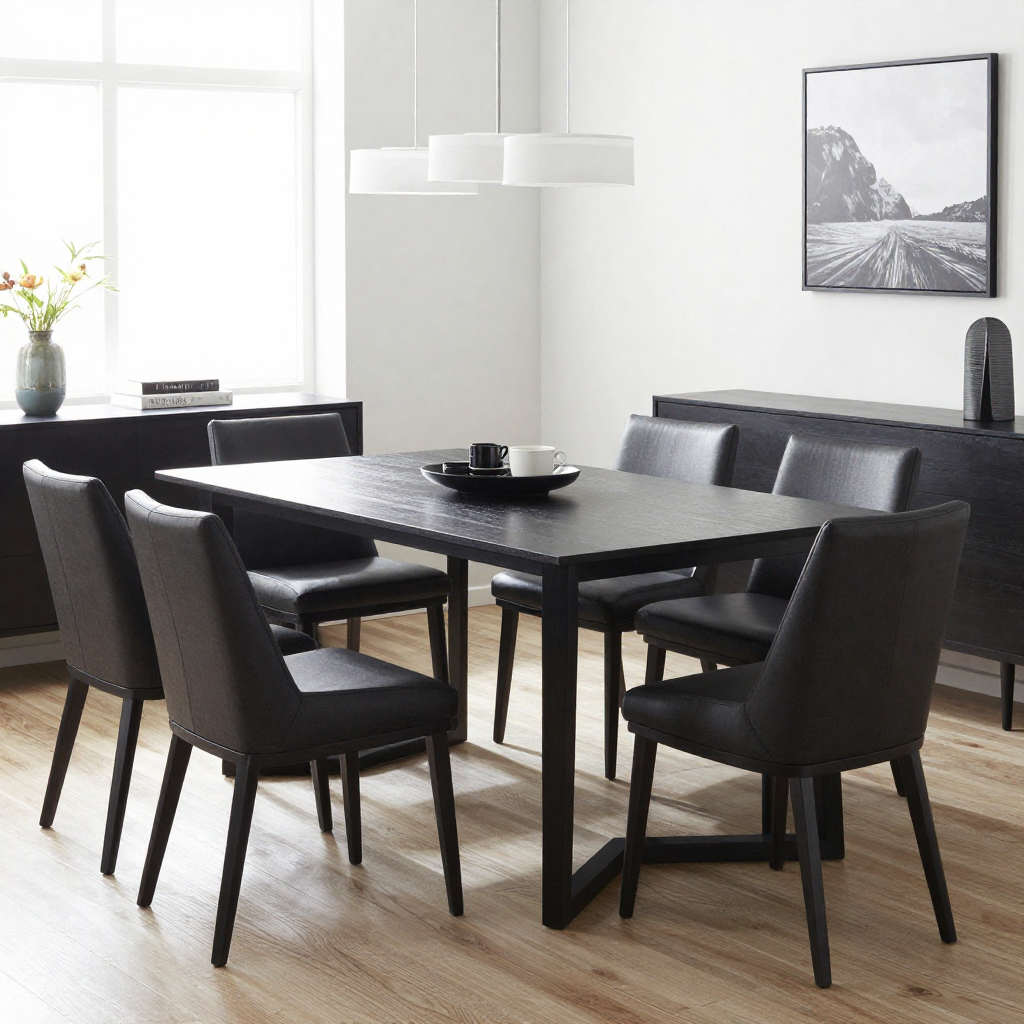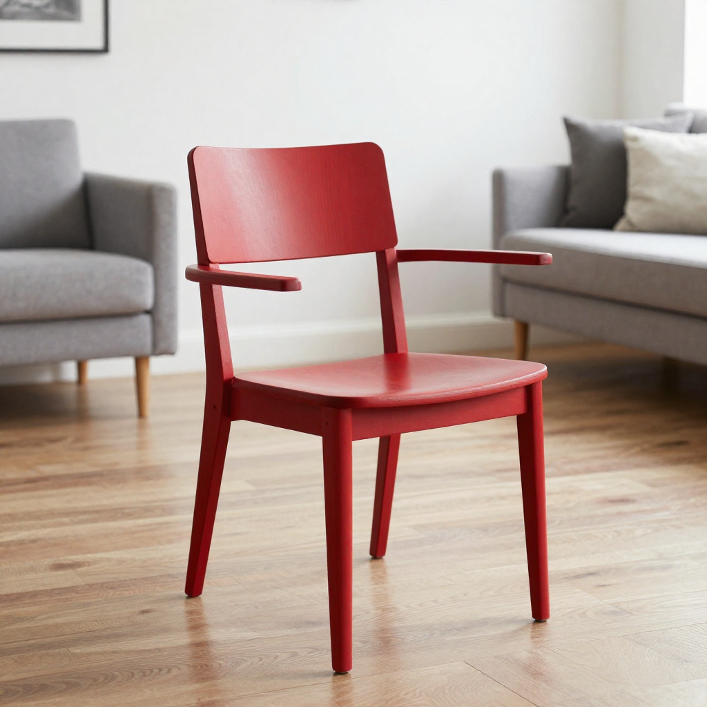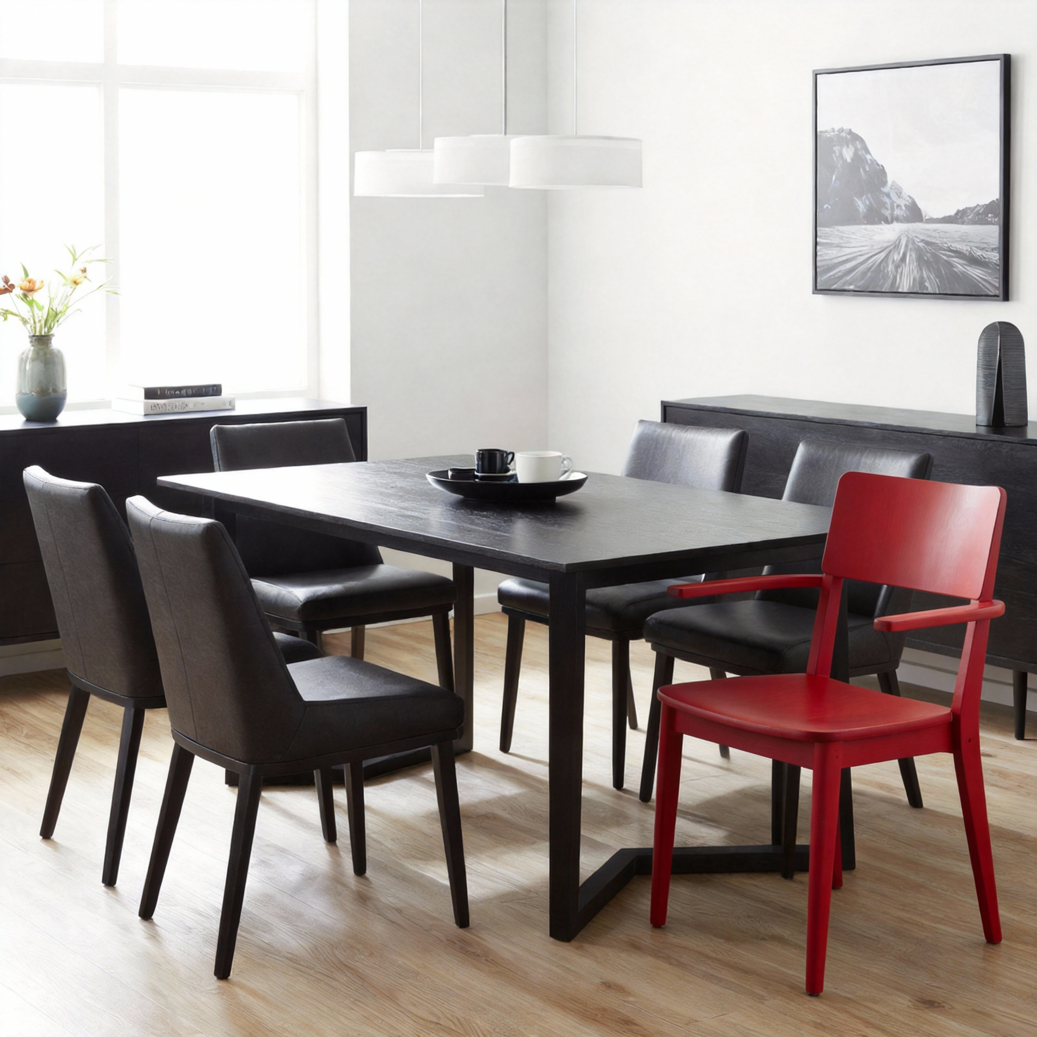 Prompt: Add the chair from the modern living room reference image into the dining room scene, placed next to the wood table.