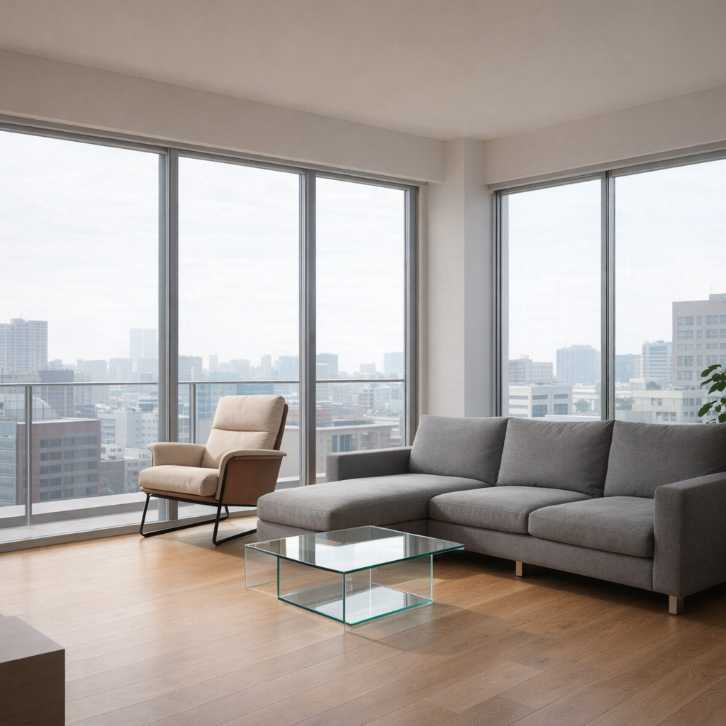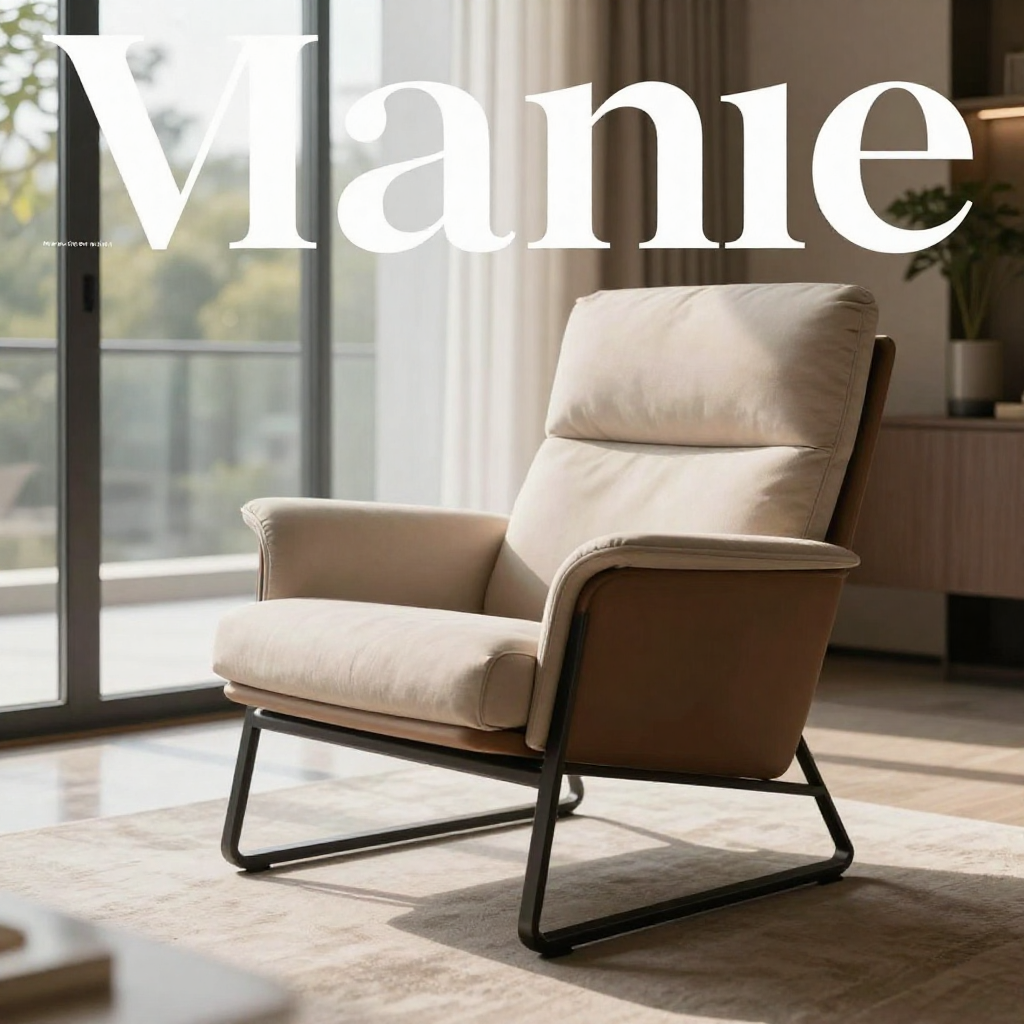 Prompt: Add the circled modern lounge chair from the furniture reference image into the red square area of interior design image.