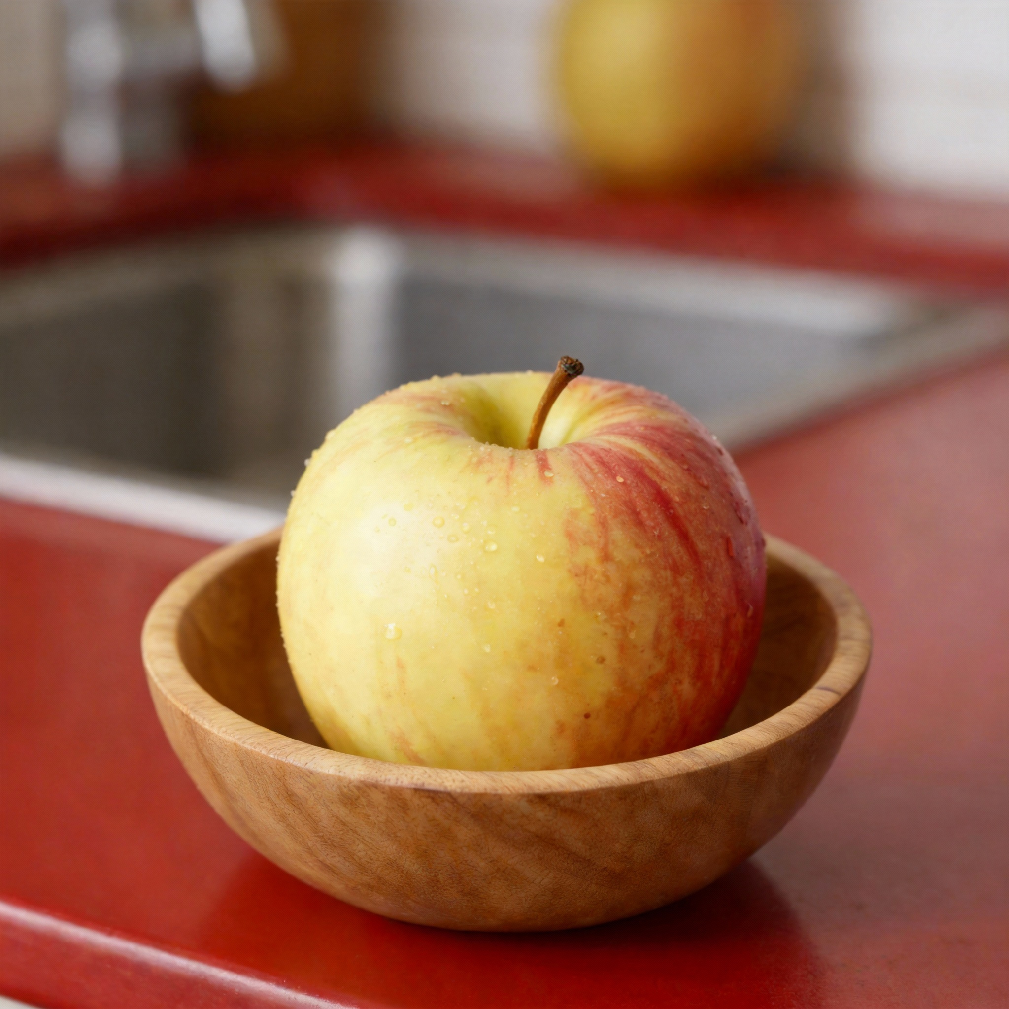 Prompt: Add the bowl to the image with the apple, place the apple in the bowl.