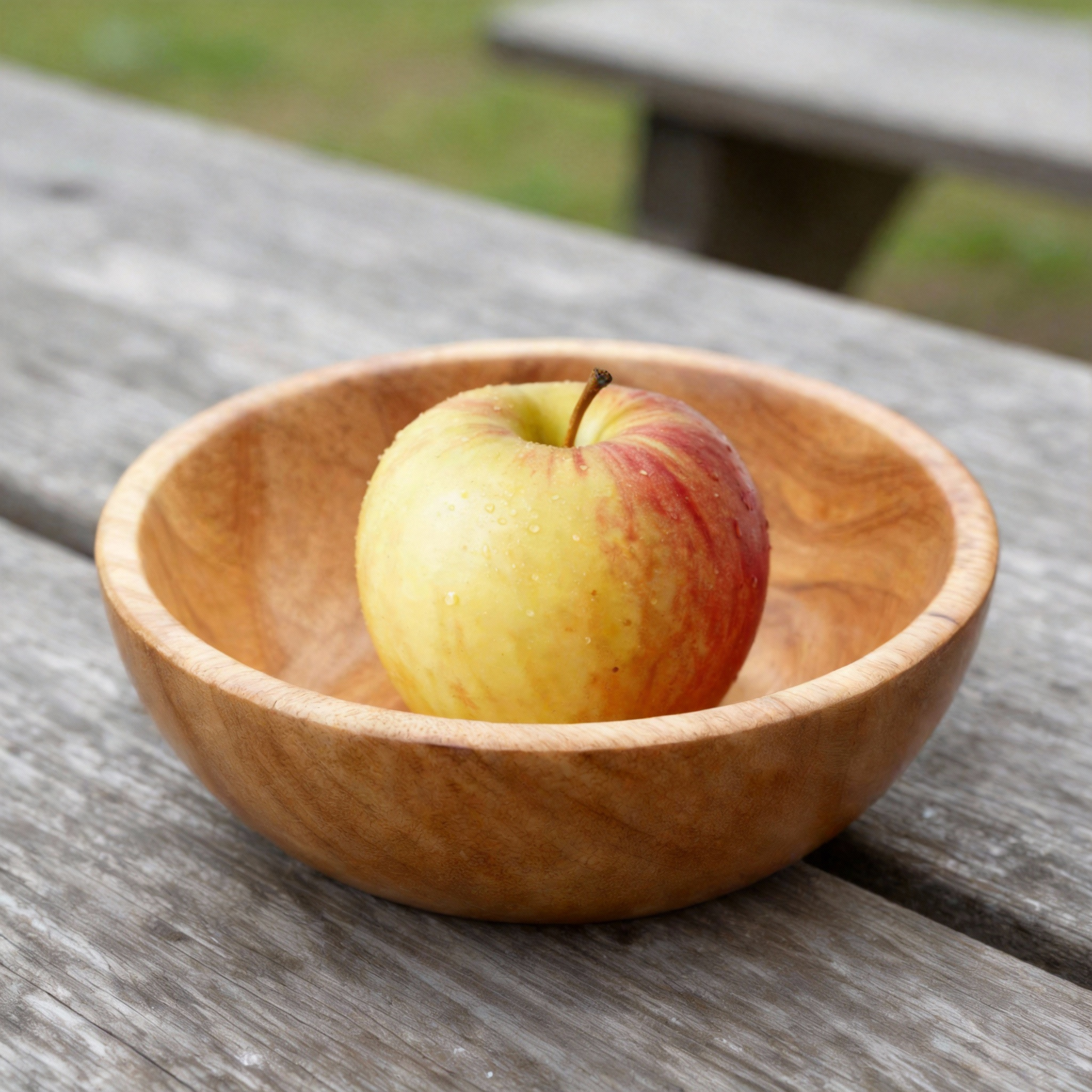 Prompt: Add the apple to the image with the bowl, place the apple in the bowl.